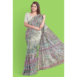 Madhubani hand painting Grey Saree on Natural Tussar Silk | Handpainted saree | Silk mark certified saree | Sari Madhubani Hand Painted - Tussar Ghicha
