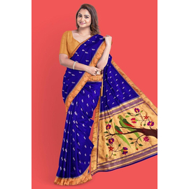 Paithani Pure Silk Saree and blouse | Indian saree | Handloom Pure Silk Paithani in gorgeous electric blue and golden | Blue and Gold Border | Parrot Pallu