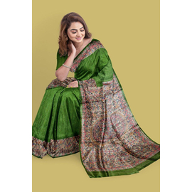 Madhubani hand painting Green Saree on Natural Tussar Silk | Handpainted saree | Silk mark certified saree | Sari Madhubani Hand Painted - Tussar Ghicha