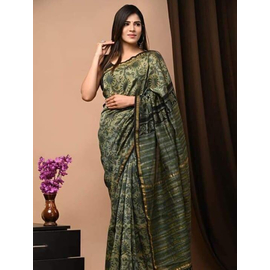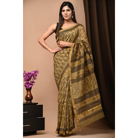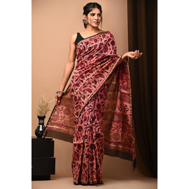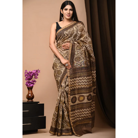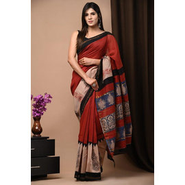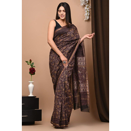 Traditional Pure Ajrakh and bagru print Hand block Printed Chanderi silk Saree With attached Unstitched Blouse, Indian wear Garden Print sari in dark brown s...