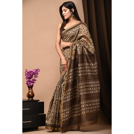 Traditional Pure Ajrakh and bagru print Hand block Printed Chanderi silk Saree With attached Unstitched Blouse, Indian sari in Brown Black Color