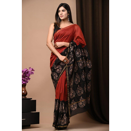 Traditional Pure Ajrakh and bagru print Hand block Printed Chanderi silk Saree With attached Unstitched Blouse, Indian Party wear sari in Black & Red Shade