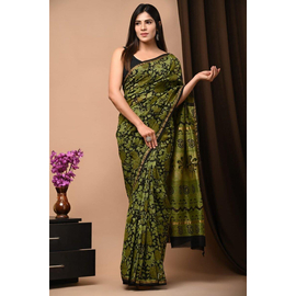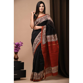 Traditional Pure Ajrakh and bagru print Hand block Printed Chanderi silk Saree With attached Unstitched Saree Blouse, Indian wear Black Garden Print sari