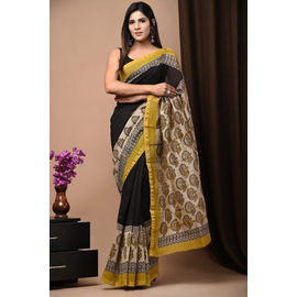 Traditional Pure Ajrakh and bagru print Hand block Printed Chanderi silk Saree With attached Unstitched Blouse, Indian Traditional ethnic wear Black Yellow sari
