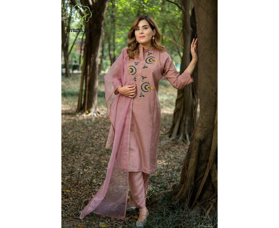 I love the elegance of this kurti set. The collar neck design and 3/4 sleeves add a regal touch. The onion pink color is simply stunning.