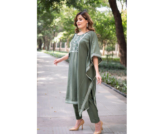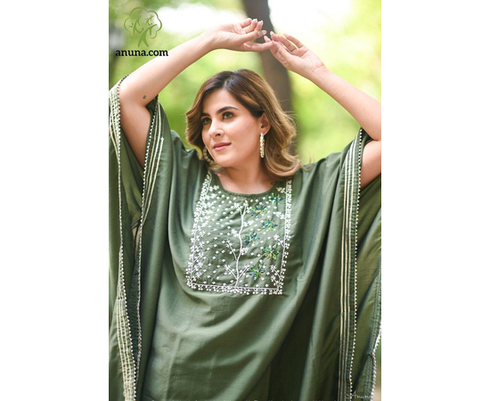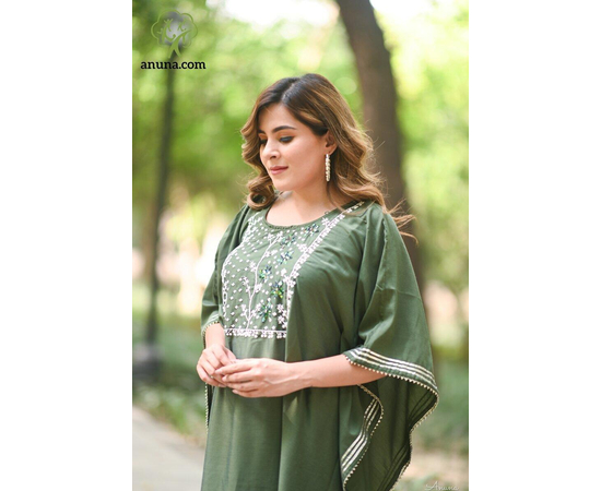 I love the elegance and comfort of this kaftan set. The cotton silk fabric feels luxurious, and the embellishments add a touch of glamour. Highly recommended.
