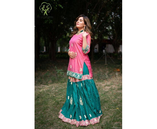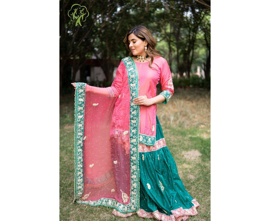"Elevate your bridal look with our stunning Pakistani gharara attire, crafted from luxurious pure silk and adorned with intricate hand embroidery from Lucknow. Perfect for weddings and special occasions, this piece embodies elegance and tradition. Shop now for a timeless statement!"