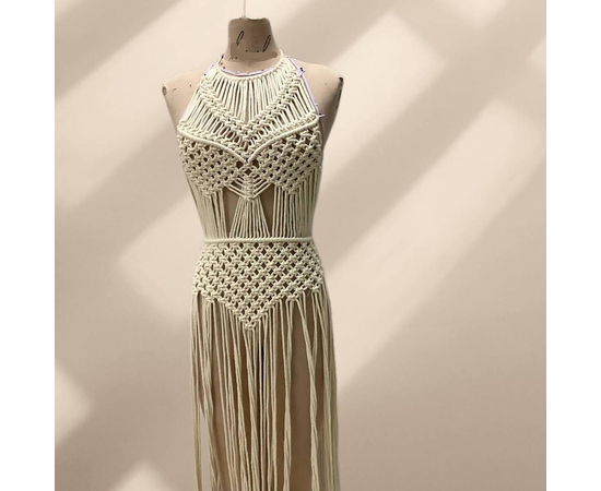 Dress is an elegant wear realized with traditional hand-knotted art of macrame.