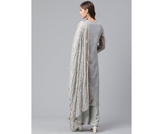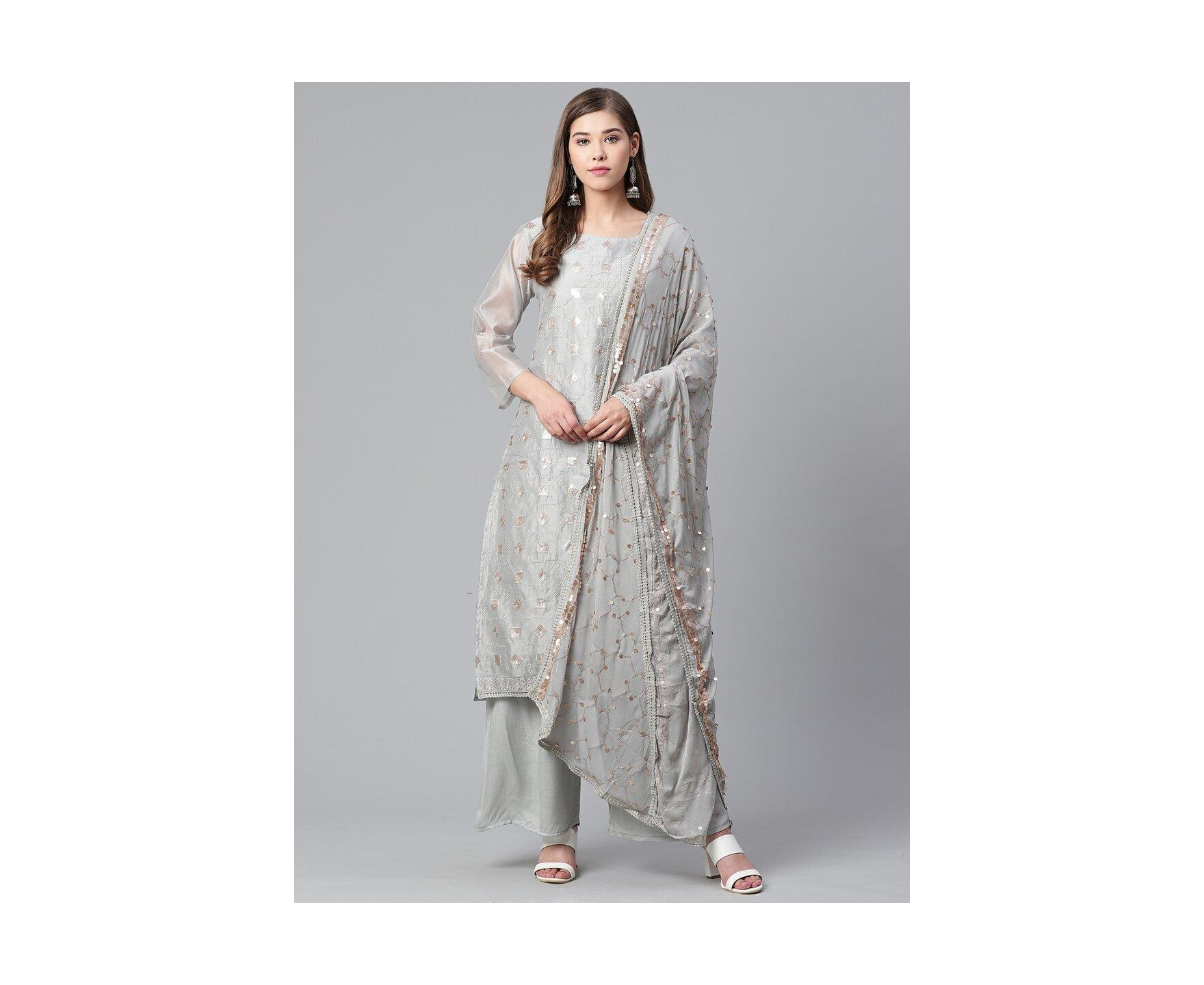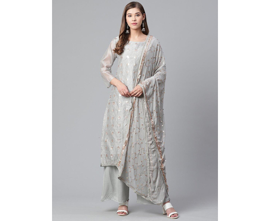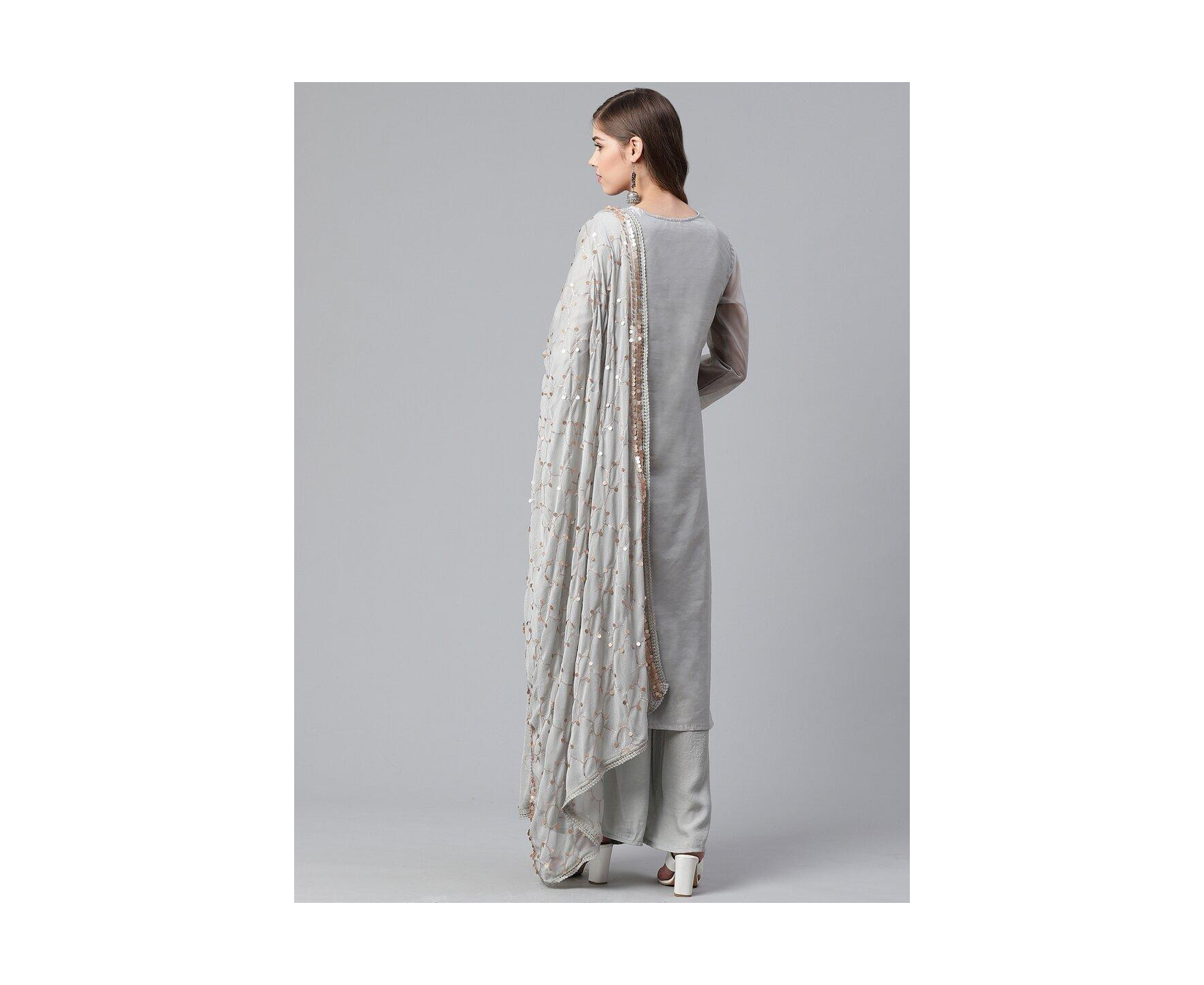 Pattern : Grey seqquined Embroided A-line Kurta Palazzo Dupatta set
