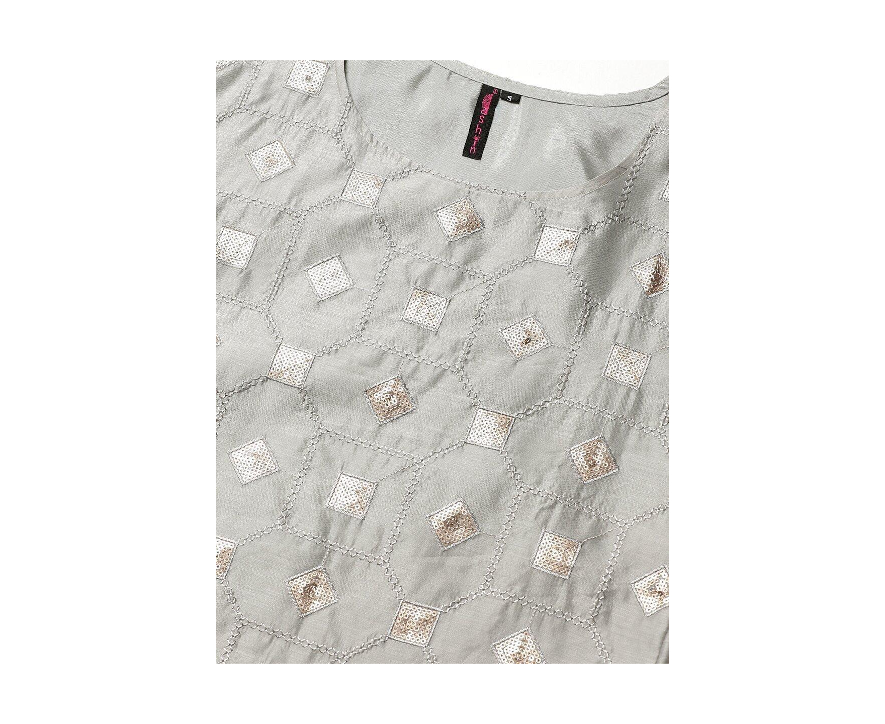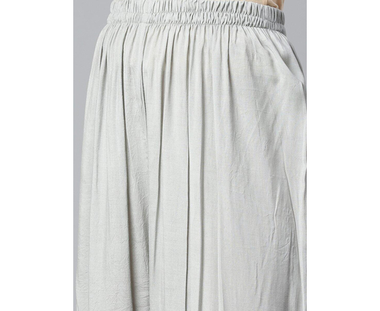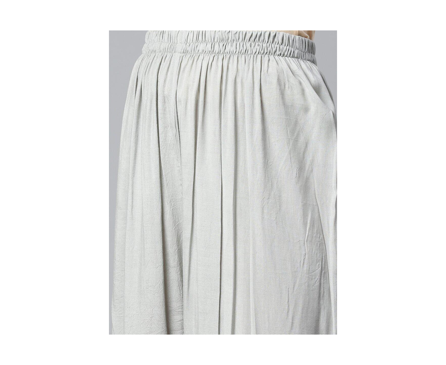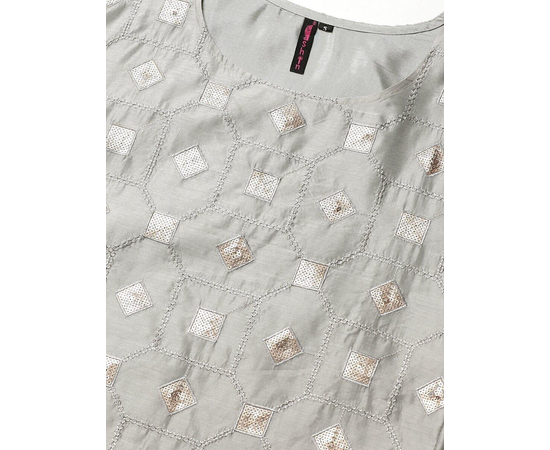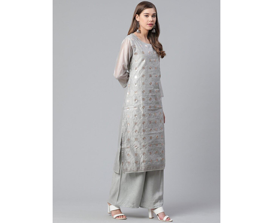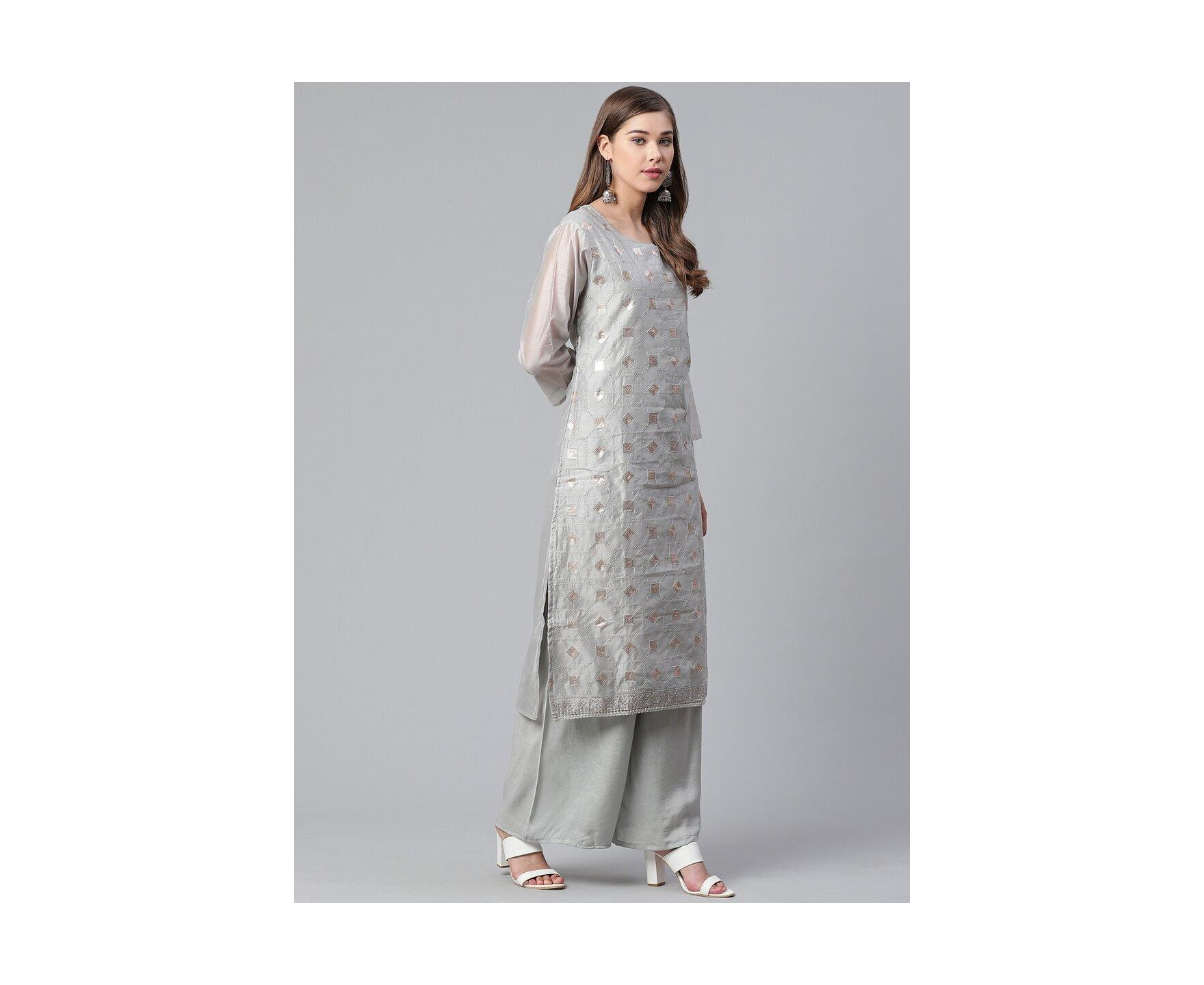 Product Detail : Grey seqquined Embroided A-line kurta Palazzo Duoatta set, has a round neck, Three-Quarter Sleeves, Straight hem, has side slit