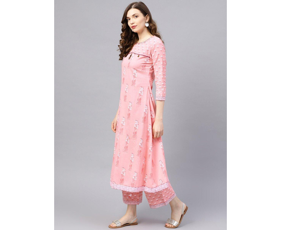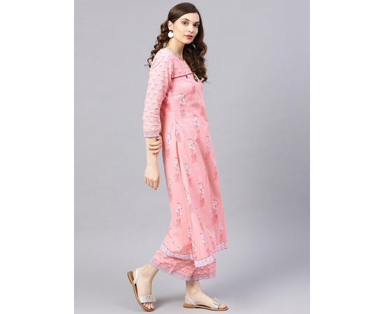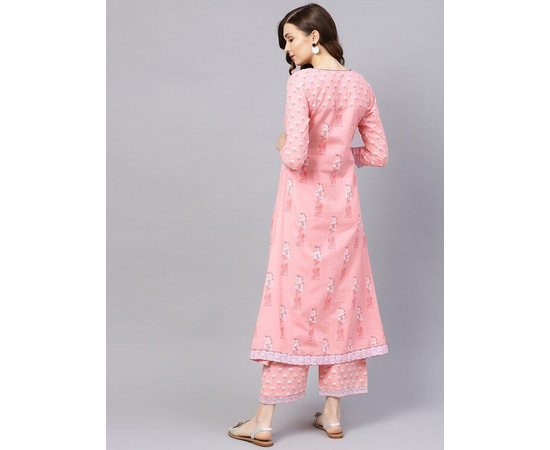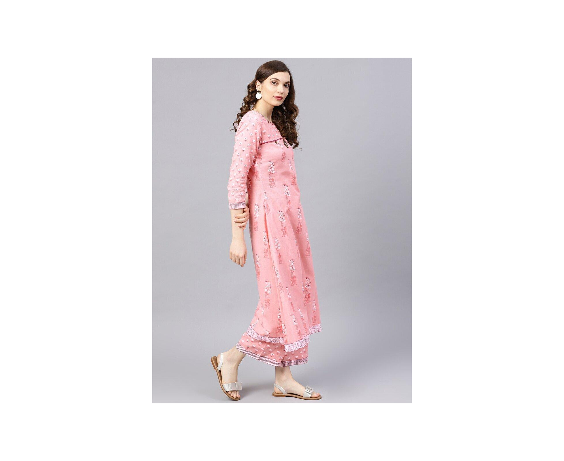 Product Detail: Pink Printed Anarkali Kurta Palazzo Set, has Round Neck, Three-Quarter Sleeves, Flared hem