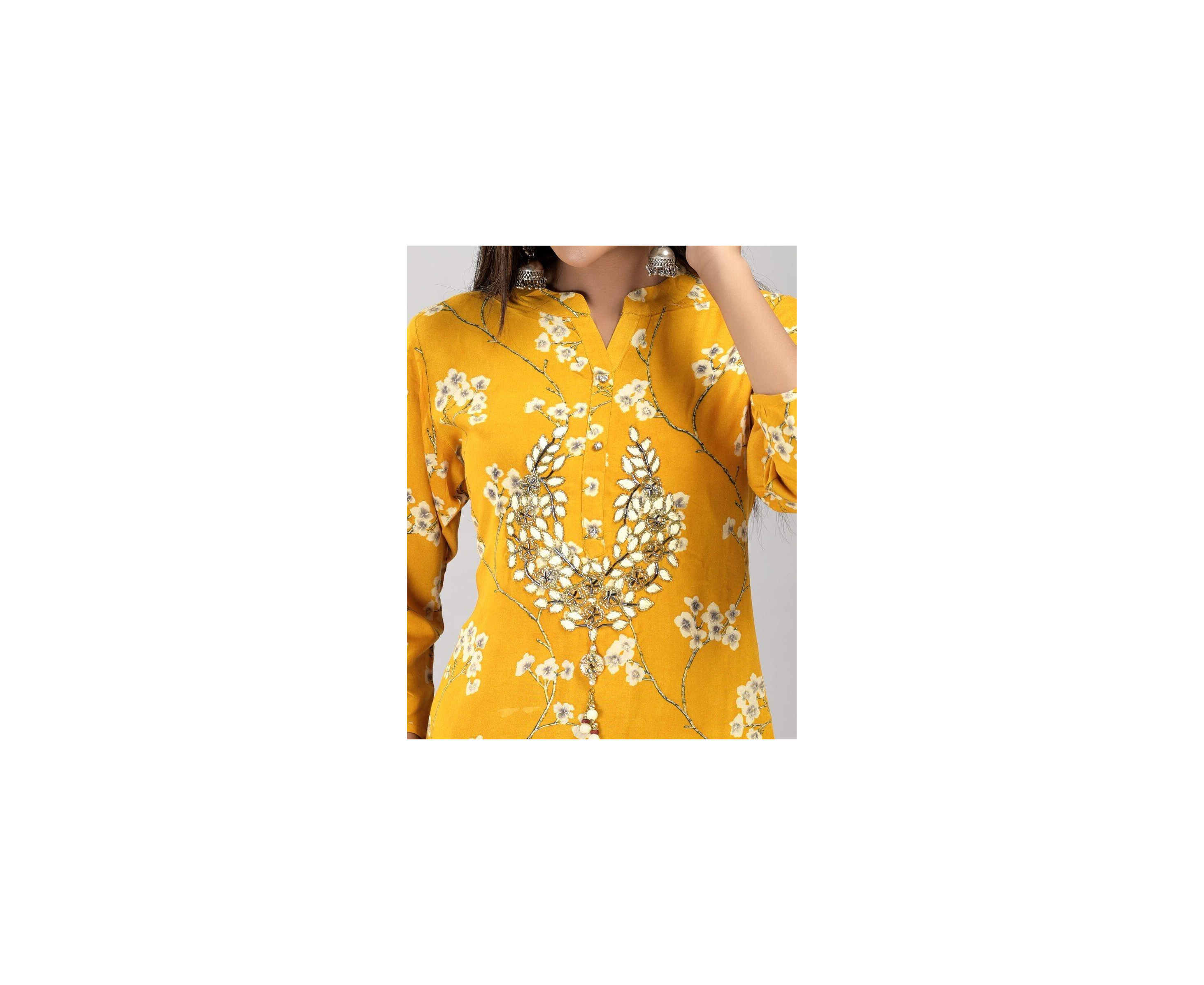 Designer Rayon Floral Printed Sequence & Embroidery Work Kurta For Woman and Girls/ Yellow Straight Kurta / Calf length Straight Printed & Gold foil Kurta with Handwork and embroidery