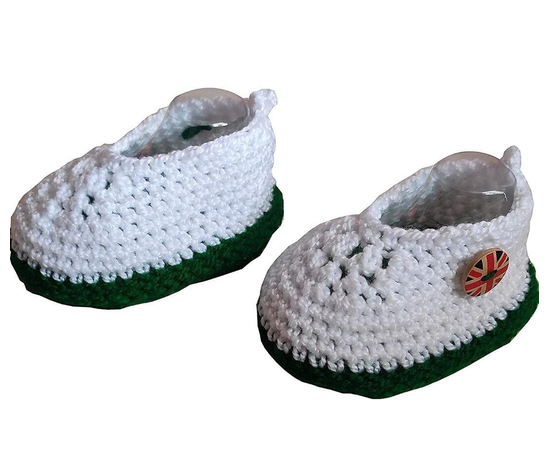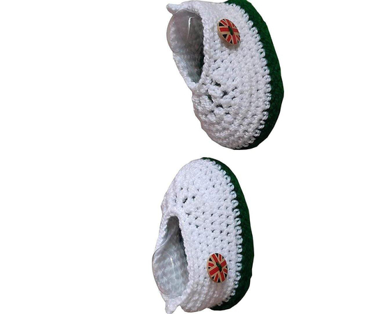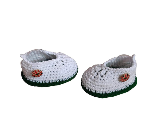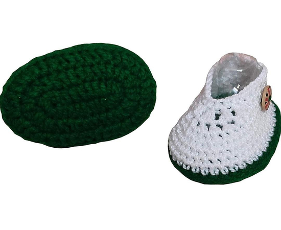 This product is made from crochet on the inside and outside and is finished in an attractive white and green color. The Booties can stretch up to 2 cms more than the size mentioned to fit your baby’s fast growing feet.