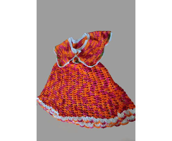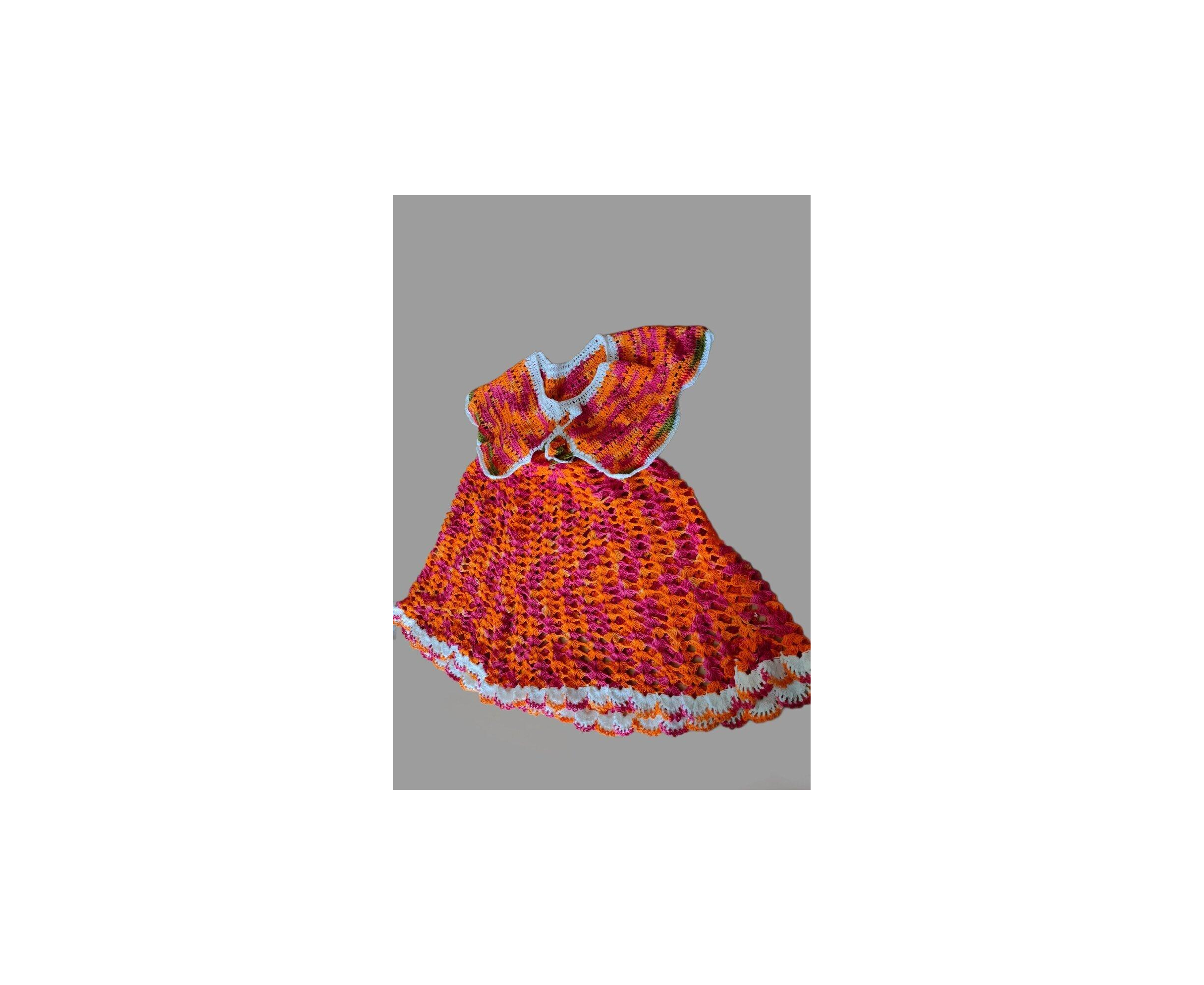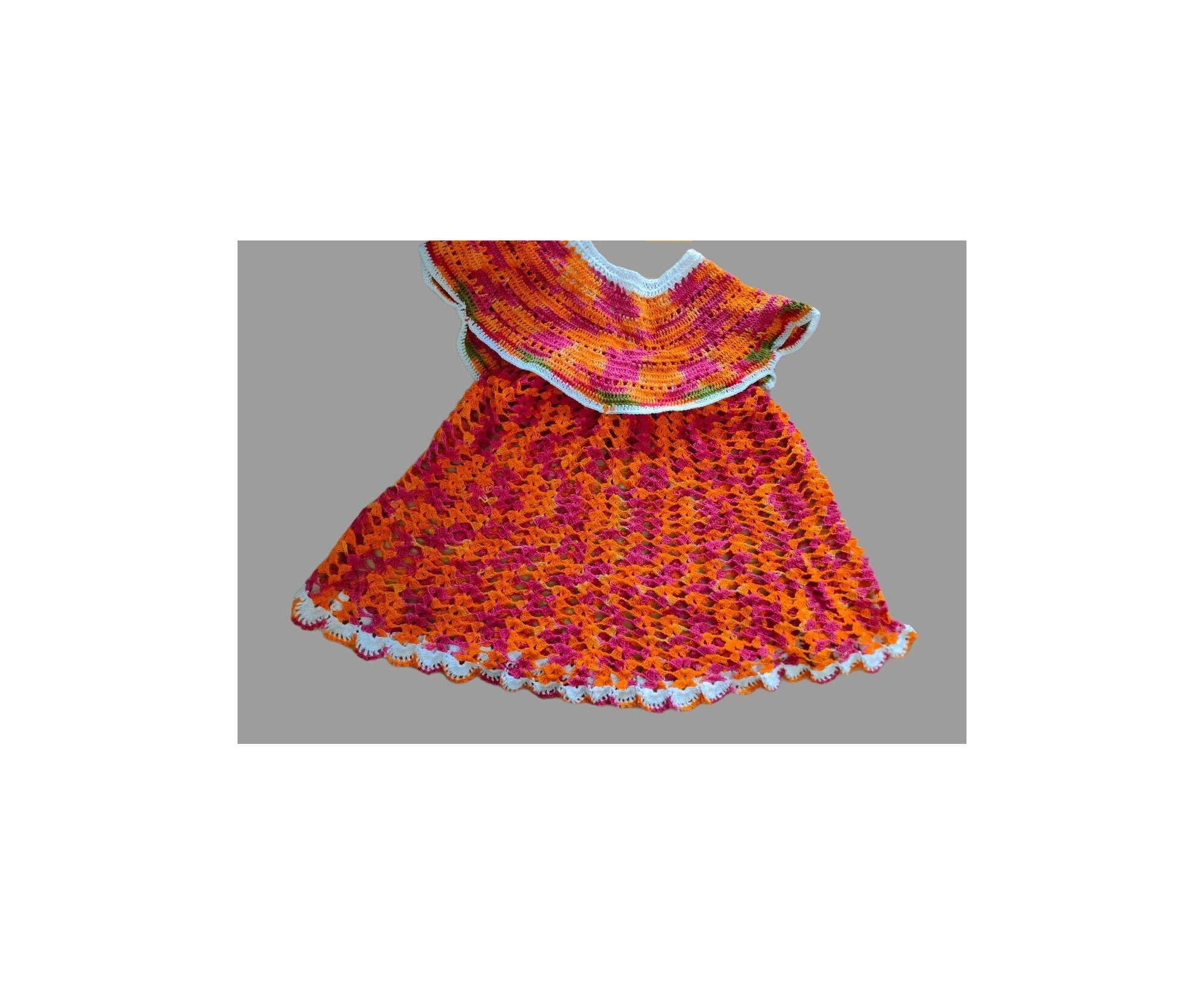Adorable baby girl dress, crocheted from pure cotton yarn in multicolor, decorated with crocheted flower in the front. This dress is a perfect combination of style and comfort, allowing them to feel comfortable and not restricted.