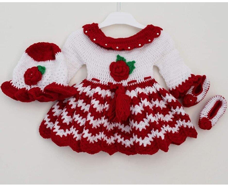 Baby crochet Dress - Christmas Outfit for baby Girls - cute infant frock - Handmade party wear frock - red white crochet frock -Crocheted red & white frock cap booties