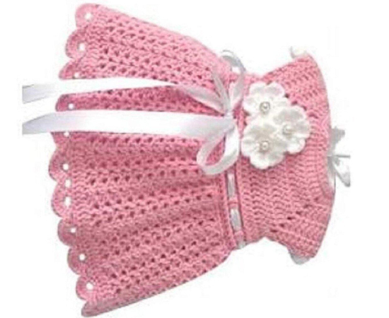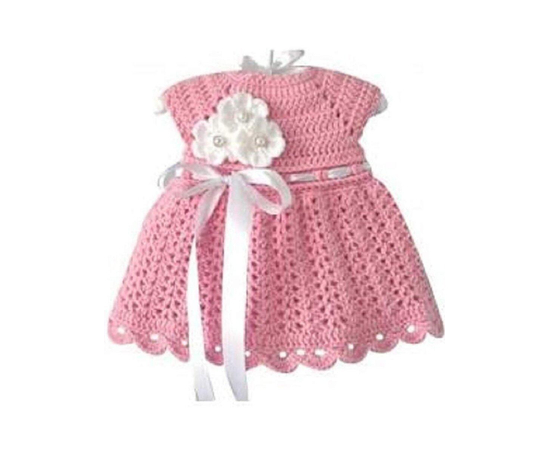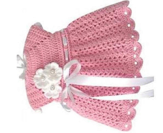 Pink baby dress with crochet flower and satin white ribbon, this gorgeous crochet dress would be perfect for a baby christening, baptism, baby blessing, special occasion, baby shower gift, Photo prop for pictures, special occasions, for any season/occasion.