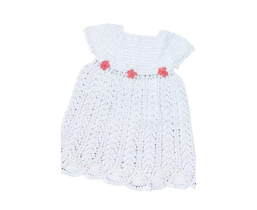 Adorable baby girl dress, crocheted from pure cotton yarn in white color, decorated with crocheted flower in the front. This dress is a perfect combination of style and comfort, allowing them to feel comfortable and not restricted.