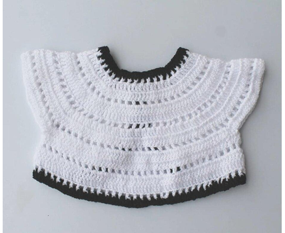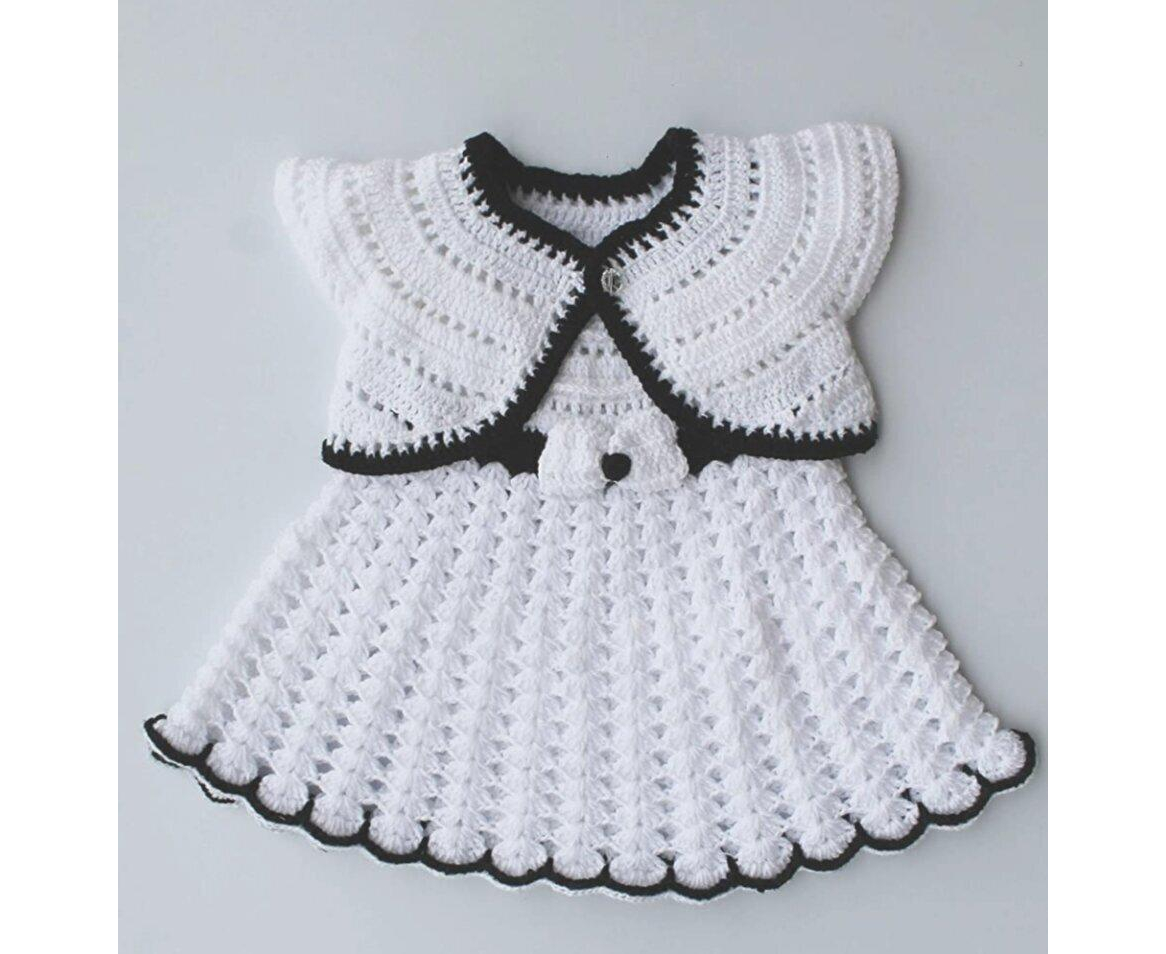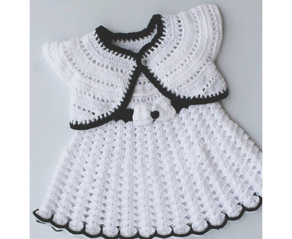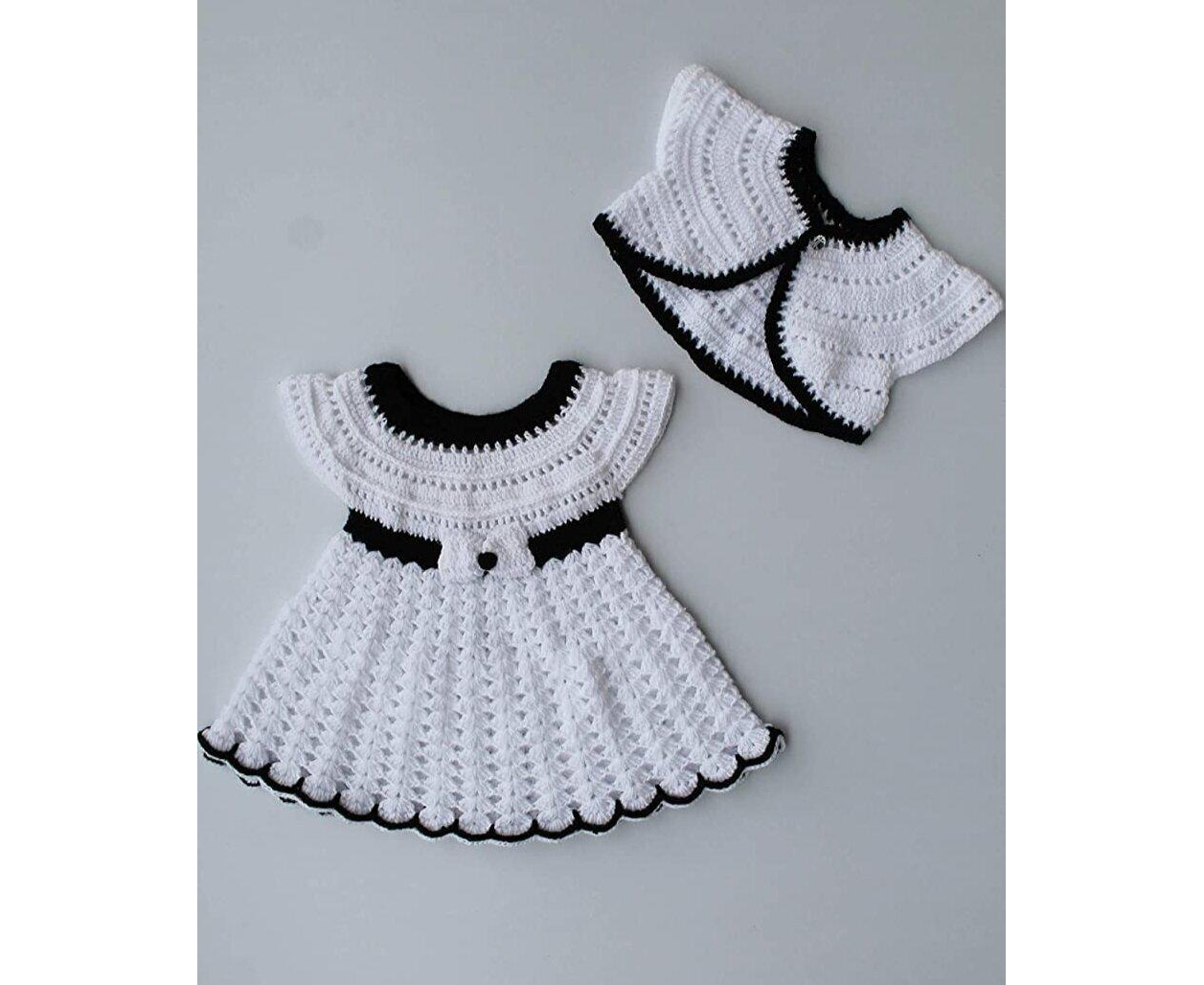 Adorable baby girl dress, crocheted from pure cotton yarn in white and black color, this frock comes with a matching shrug. This dress is a perfect combination of style and comfort, allowing them to feel comfortable and not restricted.