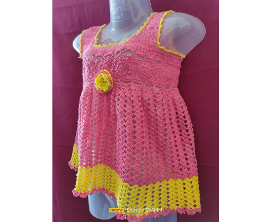 Adorable baby girl dress, crocheted from pure cotton yarn in pink and yellow color, decorated with crocheted flower in the front. This dress is a perfect combination of style and comfort, allowing them to feel comfortable and not restricted.