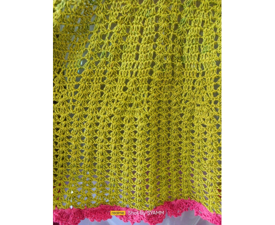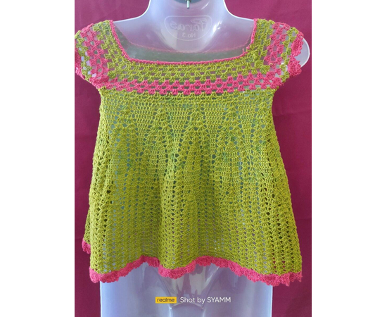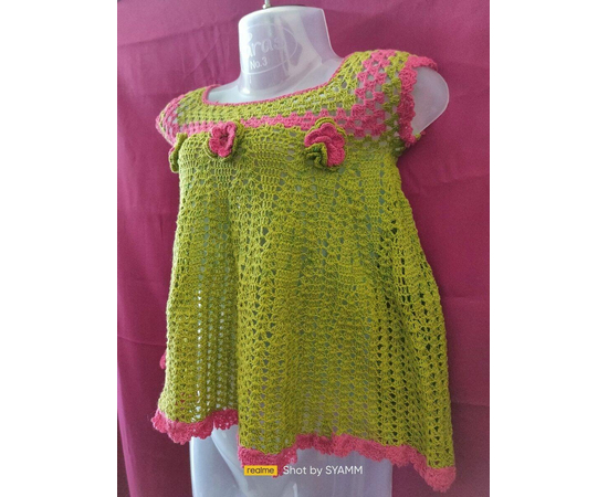 Adorable baby girl dress, crocheted from pure cotton yarn in green and pink color, decorated with crocheted flowers in the front. This dress is a perfect combination of style and comfort, allowing them to feel comfortable and not restricted.
