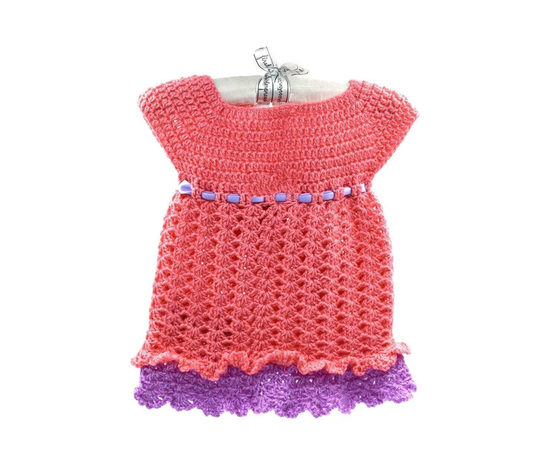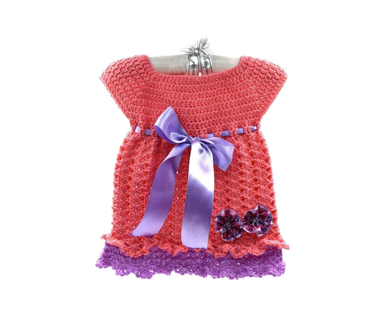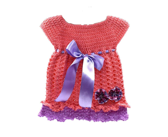 CROCHET BABY FROCK/PEACH CROCHET FROCK WITH PURPLE RIBBON/DESIGNER FROCK FOR BABIES/PARTY WEAR FROCK FOR SMALL GIRLS
