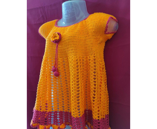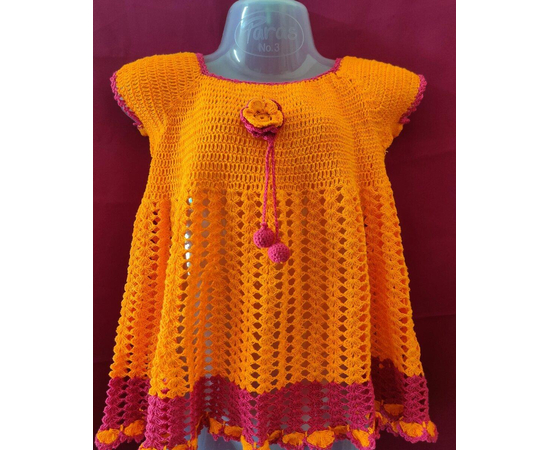 Adorable baby girl dress, crocheted from pure cotton yarn in orange and purple color, decorated with crocheted flower in the front. This dress is a perfect combination of style and comfort, allowing them to feel comfortable and not restricted.