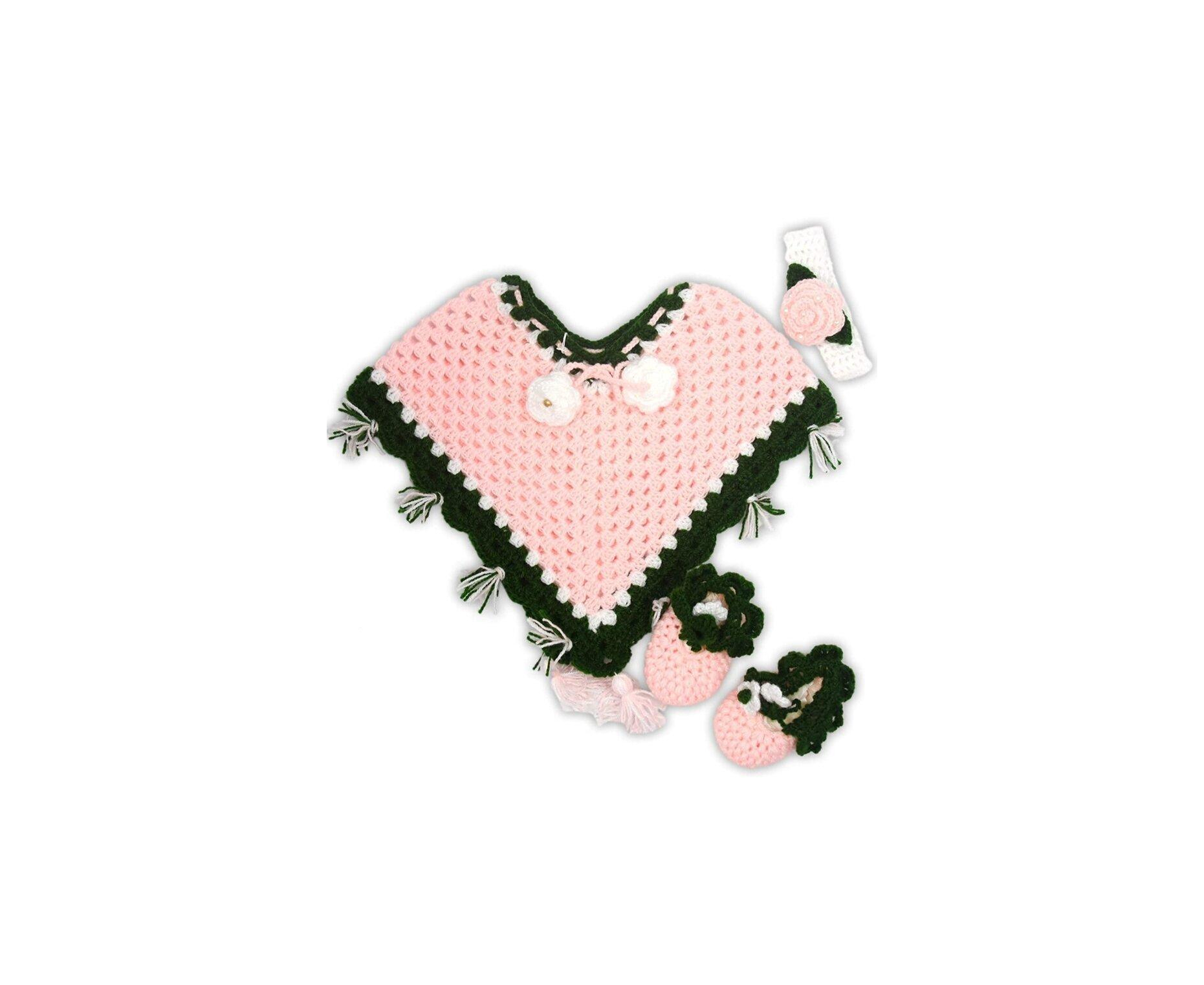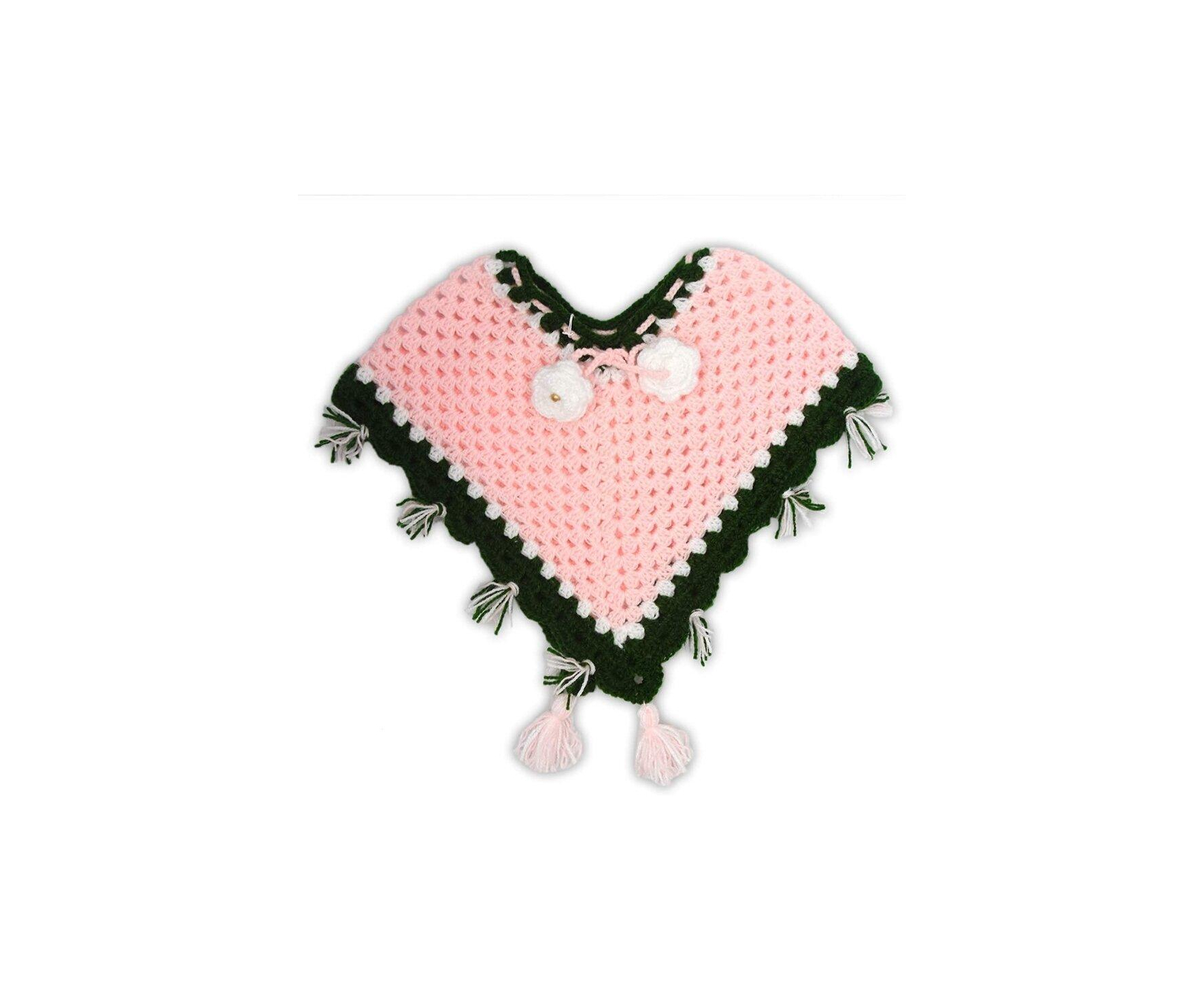 Features beautiful pink & dark green color crochet all over along with cute crochet flower to make it look funky and cool for your young girls, this set includes a crochet headband and crochet bootie/shoes. Suitable for winters, extremely trendy and stylish for casual outings and winter parties. The high quality yarn is used to make this poncho tops for girls, stylish as well as soft, silky and comfortable for skin.