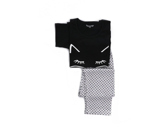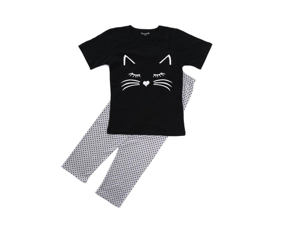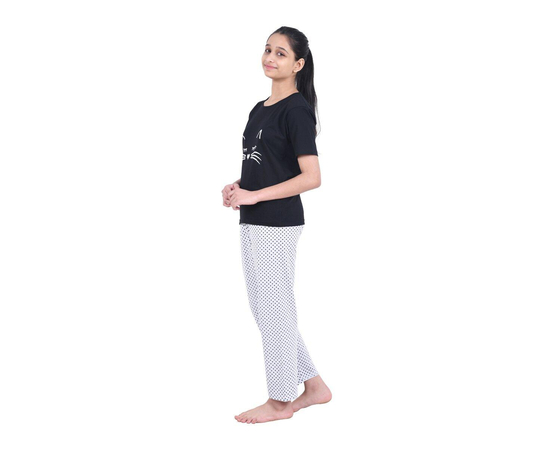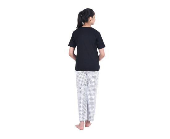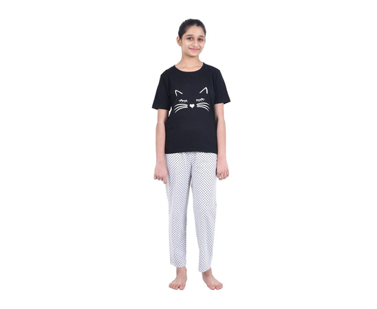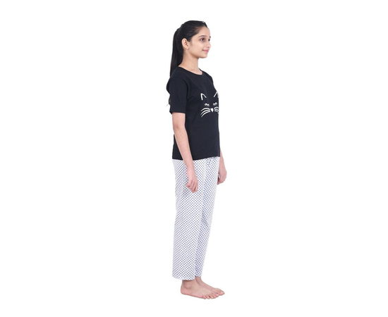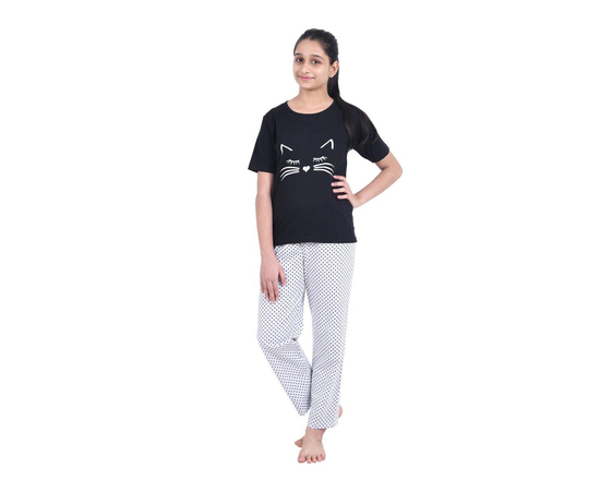 Girls Black & Grey Printed Pure Cotton Night Suit | Kids Night Dress for Girls Cotton T-shirt Pajama Set Kids Girls