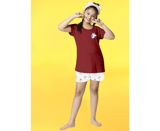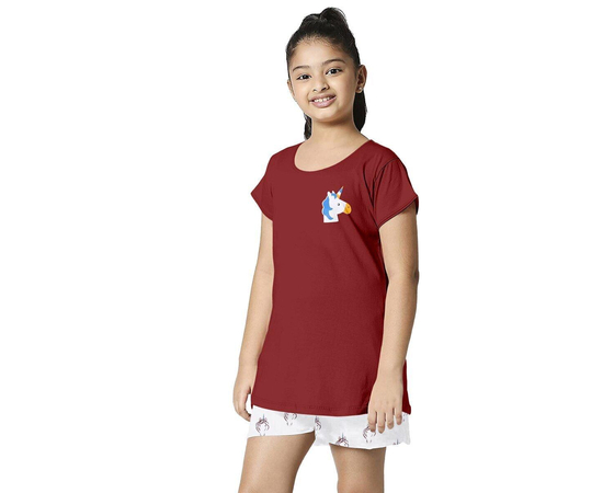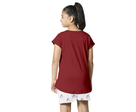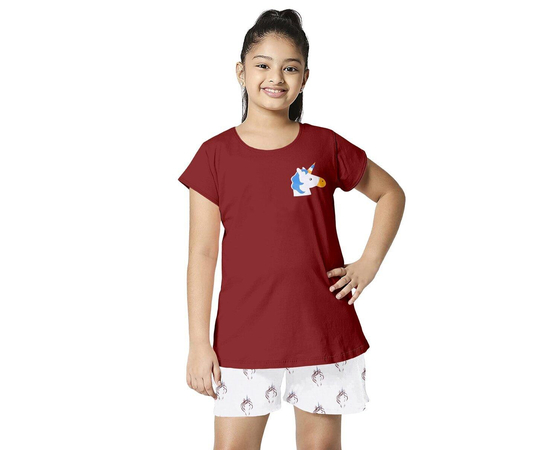 Girls' Maroon & White Unicorn Printed Night Suit | Top & Shorts Set | Cotton Top Shots Set for Kids Girls | Best Collection of Kids