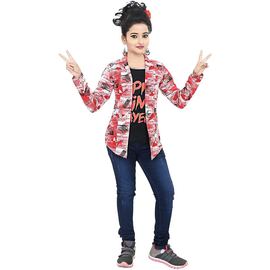 Girl's Full Sleeve Cotton Black apna time aayega Printed T-Shirt with attached Red printed Jacket Shrug