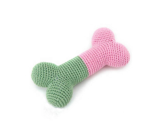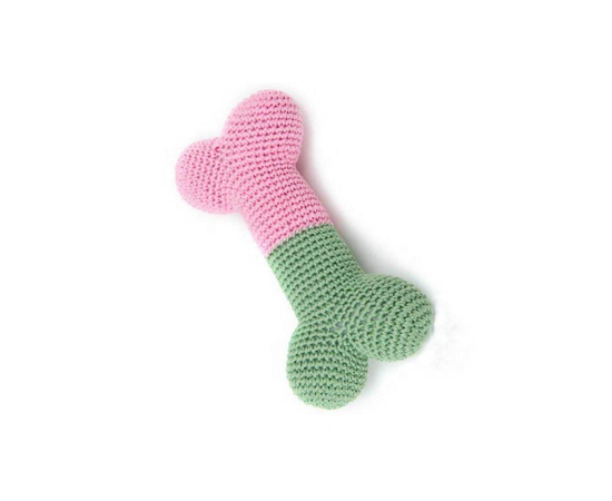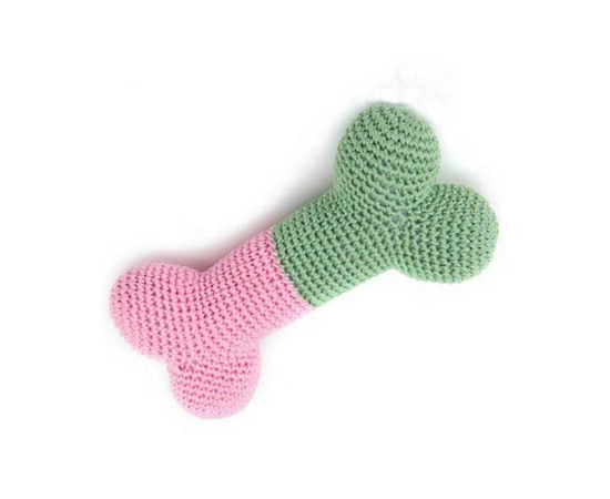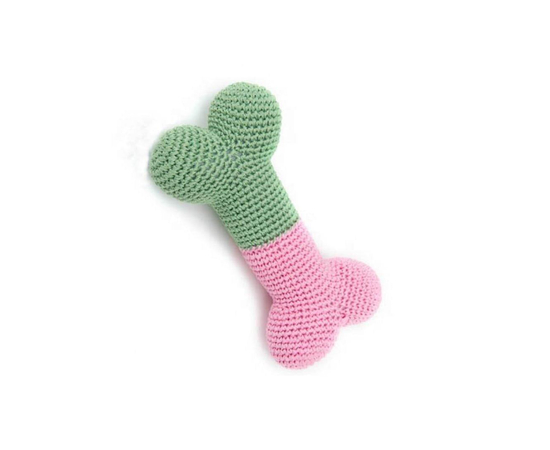 Hand crocheted, this bone will be your pet's favorite toy! Soft, lightweight, yet durable, this bone is 7 inches long. It is perfect for small dogs and puppies to fetch, toss, chew, and just plain have some doggy fun!