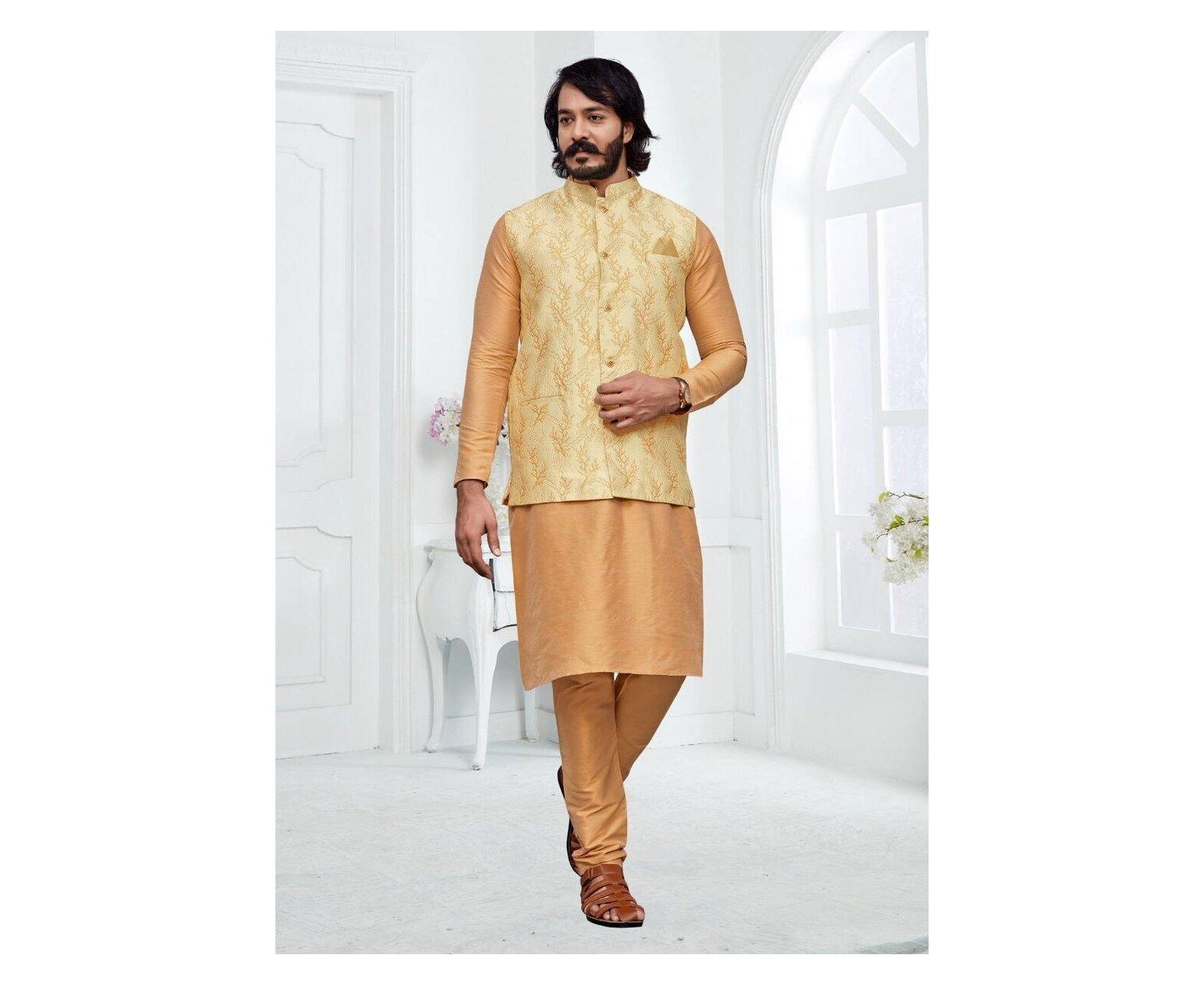 Get ready to make a lasting impression with our Beige color Jacquard Party Wear Kurta Pajama with Jacket for Men. Meticulously crafted from silk fabric, this ensemble showcases a stunning sky-blue color that exudes elegance and charm. The highlight of this outfit is the jacquard printed jacket in cream with intricate golden accents, which adds a touch of luxury and sophistication. Whether it's a wedding, festival, or any special occasion, this kurta pajama with a jacket is sure to make you stand out. The comfortable fit and high-quality craftsmanship ensure that you feel confident and stylish throughout the event. The outfit is available in sizes M, L, XL, and XXL, catering to different body types and preferences. Additionally, the inclusion of both side pockets enhances functionality, allowing you to conveniently carry your essentials. With its impeccable finishing and attention to detail, our Beige color  Jacquard Party Wear Kurta Pajama with Jacket for Men offers the perfect blend of comfort, style, and quality.
