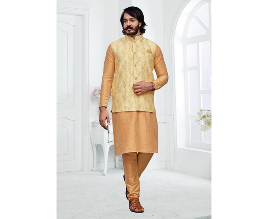 Get ready to make a lasting impression with our Beige color Jacquard Party Wear Kurta Pajama with Jacket for Men. Meticulously crafted from silk fabric, this ensemble showcases a stunning sky-blue color that exudes elegance and charm. The highlight of this outfit is the jacquard printed jacket in cream with intricate golden accents, which adds a touch of luxury and sophistication. Whether it's a wedding, festival, or any special occasion, this kurta pajama with a jacket is sure to make you stand out. The comfortable fit and high-quality craftsmanship ensure that you feel confident and stylish throughout the event. The outfit is available in sizes M, L, XL, and XXL, catering to different body types and preferences. Additionally, the inclusion of both side pockets enhances functionality, allowing you to conveniently carry your essentials. With its impeccable finishing and attention to detail, our Beige color  Jacquard Party Wear Kurta Pajama with Jacket for Men offers the perfect blend of comfort, style, and quality.
