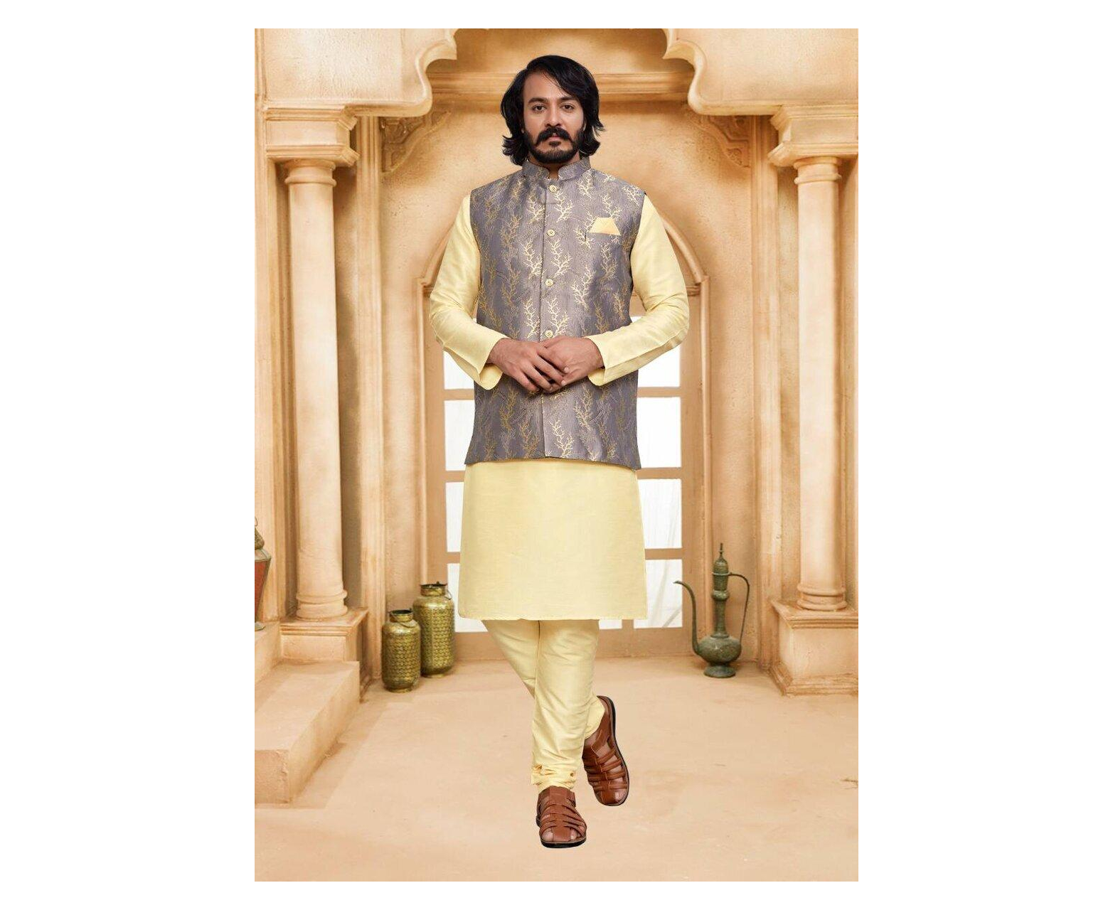 Enhance Your Style with our Cream Ciolor Jacquard Party Wear Kurta Pajama with Jacket for Men.