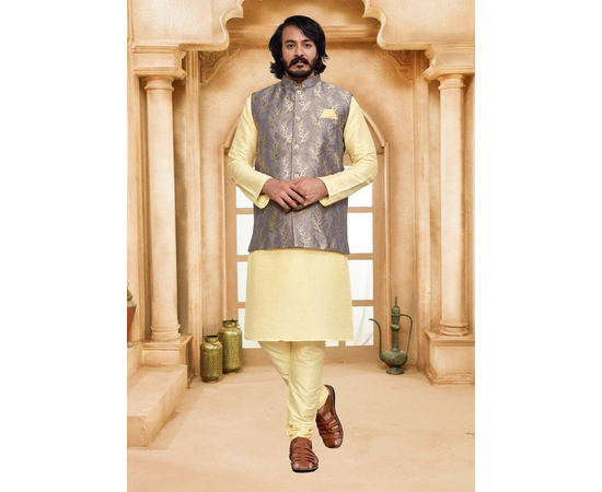 Get ready to make a lasting impression with our Sky-Blue Jacquard Party Wear Kurta Pajama with Jacket for Men. Meticulously crafted from silk fabric, this ensemble showcases a stunning sky-blue color that exudes elegance and charm. The highlight of this outfit is the jacquard printed jacket in cream with intricate golden accents, which adds a touch of luxury and sophistication. Whether it's a wedding, festival, or any special occasion, this kurta pajama with a jacket is sure to make you stand out. The comfortable fit and high-quality craftsmanship ensure that you feel confident and stylish throughout the event. The outfit is available in sizes M, L, XL, and XXL, catering to different body types and preferences. Additionally, the inclusion of both side pockets enhances functionality, allowing you to conveniently carry your essentials. With its impeccable finishing and attention to detail, our Sky-Blue Jacquard Party Wear Kurta Pajama with Jacket for Men offers the perfect blend of comfort, style, and quality.