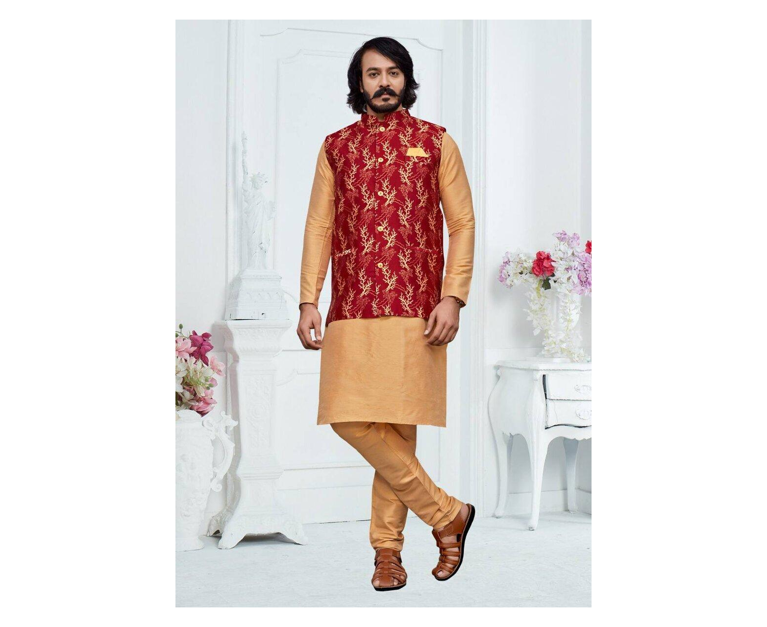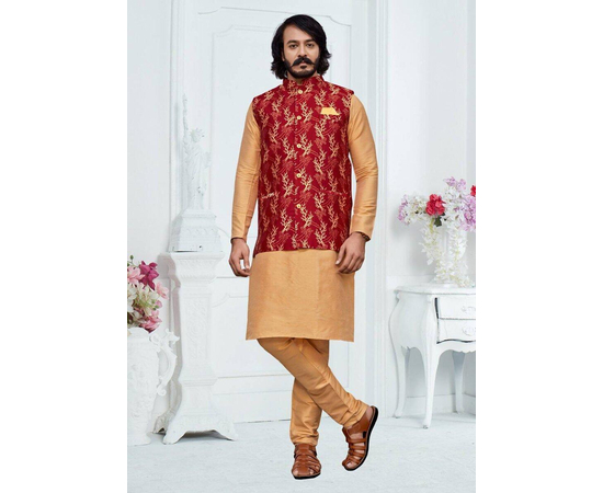 Get ready to make a lasting impression with our Pink color Jacquard Party Wear Kurta Pajama with Jacket for Men. Meticulously crafted from silk fabric, this ensemble showcases a stunning Pink color that exudes elegance and charm. The highlight of this outfit is the jacquard printed jacket in cream with intricate golden accents, which adds a touch of luxury and sophistication. Whether it's a wedding, festival, or any special occasion, this kurta pajama with a jacket is sure to make you stand out. The comfortable fit and high-quality craftsmanship ensure that you feel confident and stylish throughout the event. The outfit is available in sizes M, L, XL, and XXL, catering to different body types and preferences. Additionally, the inclusion of both side pockets enhances functionality, allowing you to conveniently carry your essentials. With its impeccable finishing and attention to detail, our Pink Jacquard Party Wear Kurta Pajama with Jacket for Men offers the perfect blend of comfort, style, and quality.