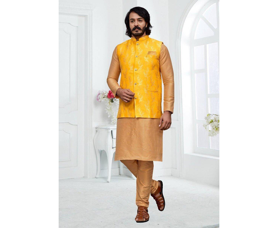 Get ready to make a lasting impression with our Yellow color Jacquard Party Wear Kurta Pajama with Jacket for Men. Meticulously crafted from silk fabric, this ensemble showcases a stunning Yellow color that exudes elegance and charm. The highlight of this outfit is the jacquard printed jacket in cream with intricate golden accents, which adds a touch of luxury and sophistication. Whether it's a wedding, festival, or any special occasion, this kurta pajama with a jacket is sure to make you stand out. The comfortable fit and high-quality craftsmanship ensure that you feel confident and stylish throughout the event. The outfit is available in sizes M, L, XL, and XXL, catering to different body types and preferences. Additionally, the inclusion of both side pockets enhances functionality, allowing you to conveniently carry your essentials. With its impeccable finishing and attention to detail, our Sky-Blue Jacquard Party Wear Kurta Pajama with Jacket for Men offers the perfect blend of comfort, style, and quality.