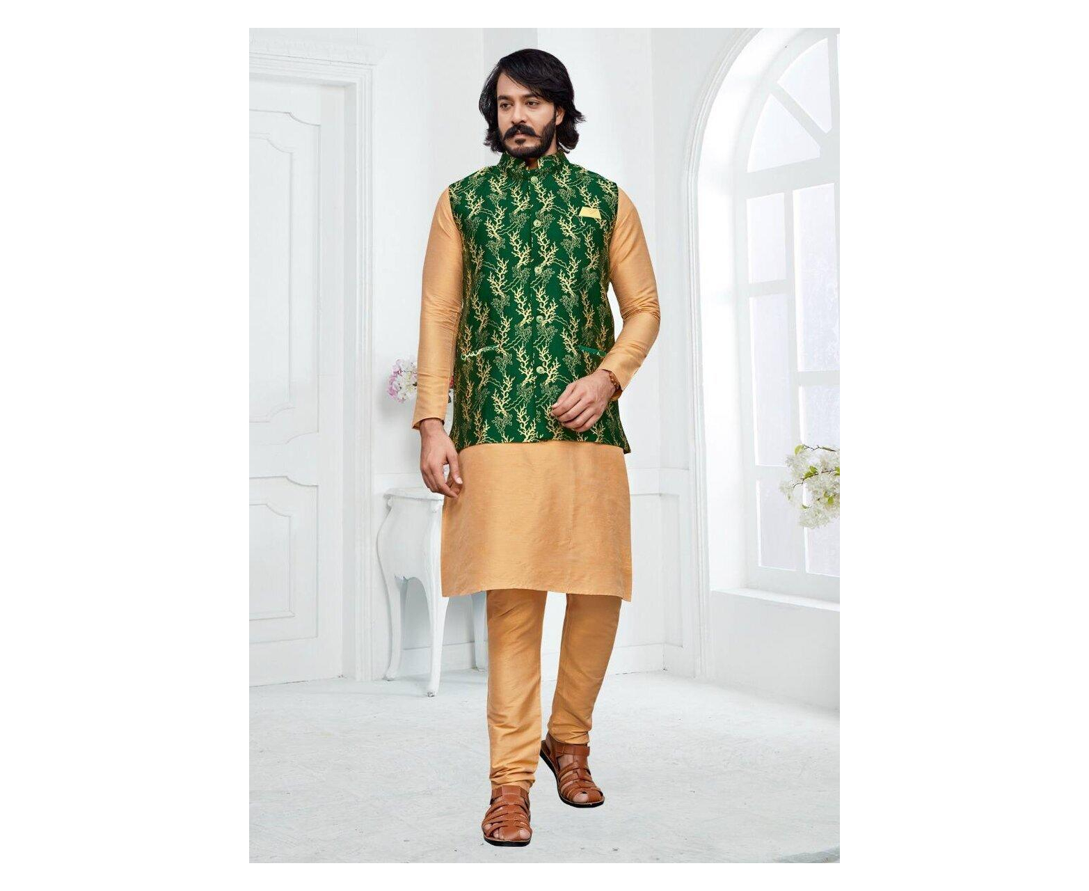 Get ready to make a lasting impression with our Yellow color Jacquard Party Wear Kurta Pajama with Jacket for Men. Meticulously crafted from silk fabric, this ensemble showcases a stunning Yellow color that exudes elegance and charm. The highlight of this outfit is the jacquard printed jacket in cream with intricate golden accents, which adds a touch of luxury and sophistication. Whether it's a wedding, festival, or any special occasion, this kurta pajama with a jacket is sure to make you stand out. The comfortable fit and high-quality craftsmanship ensure that you feel confident and stylish throughout the event. The outfit is available in sizes M, L, XL, and XXL, catering to different body types and preferences. Additionally, the inclusion of both side pockets enhances functionality, allowing you to conveniently carry your essentials. With its impeccable finishing and attention to detail, our Sky-Blue Jacquard Party Wear Kurta Pajama with Jacket for Men offers the perfect blend of comfort, style, and quality.