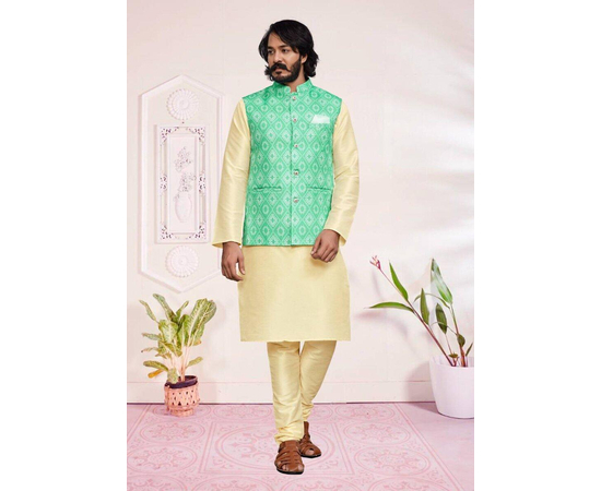 Add a touch of sophistication to your ethnic wardrobe with our Light Green and Cream Jute Cotton Party Wear Kurta Pajama with Jacket for Men. Made from high-quality silk fabric in a stylish cream color, this ensemble is designed to impress. The jute cotton printed jacket in a delightful light green shade adds a unique and trendy element to the outfit. Available in multiple sizes, this kurta pajama set is crafted with attention to detail and offers the best quality and finishing.