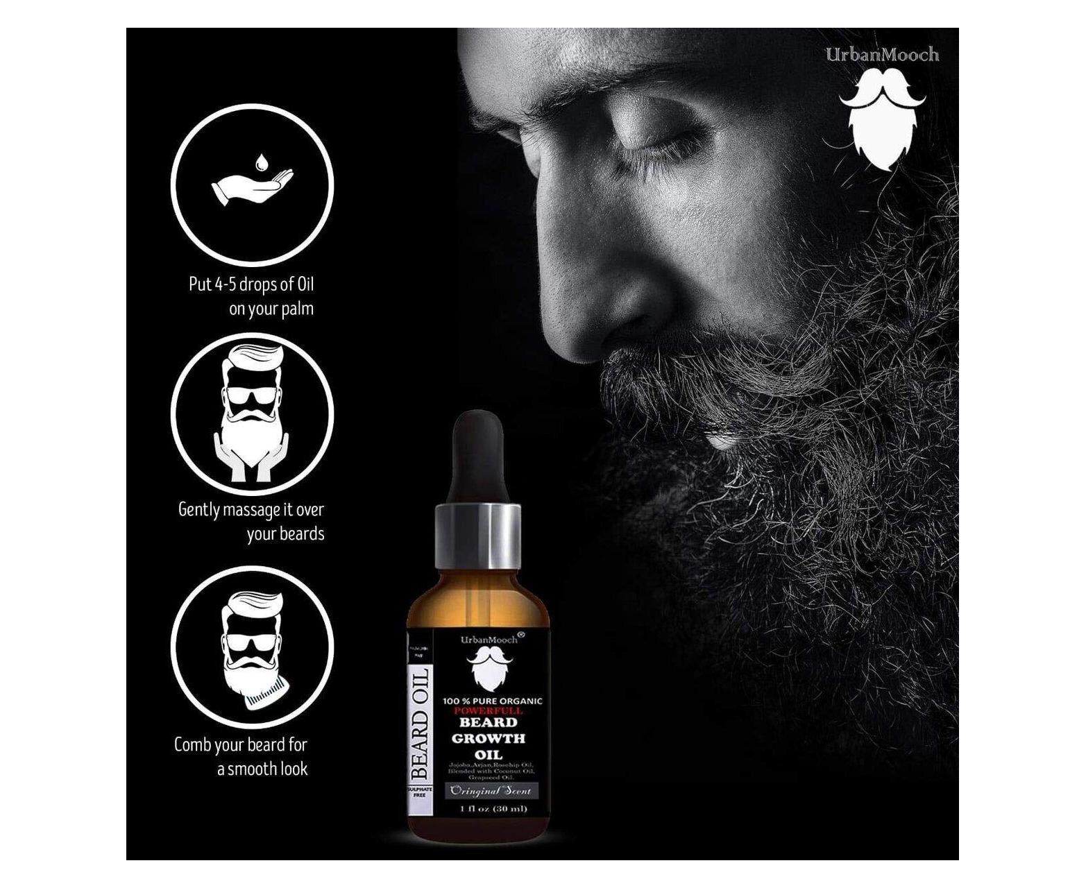 - This Beard Growth Oil is infused with red onion extract for men helps promote healthy beard and mustache growth. It also strengthens the beard and provides a deep nourishment to the hair follicles leading to healthy, stronger, fuzz free beards. It also ensure your beard looks even from all ends.