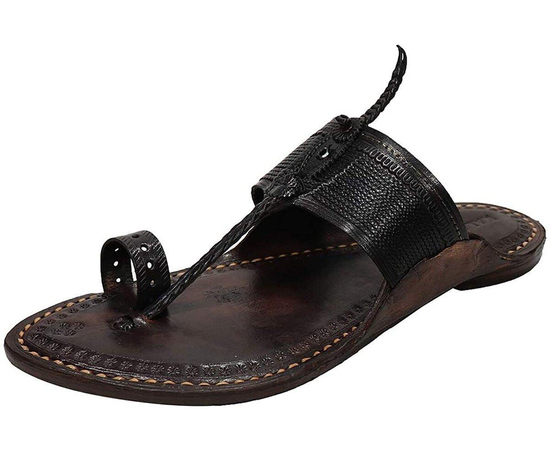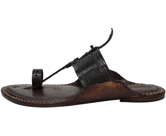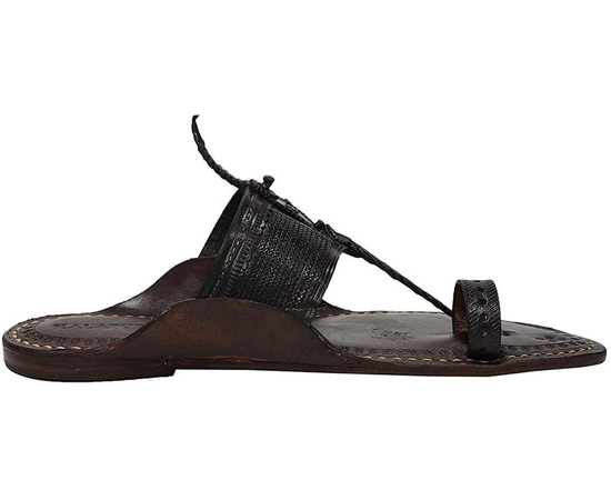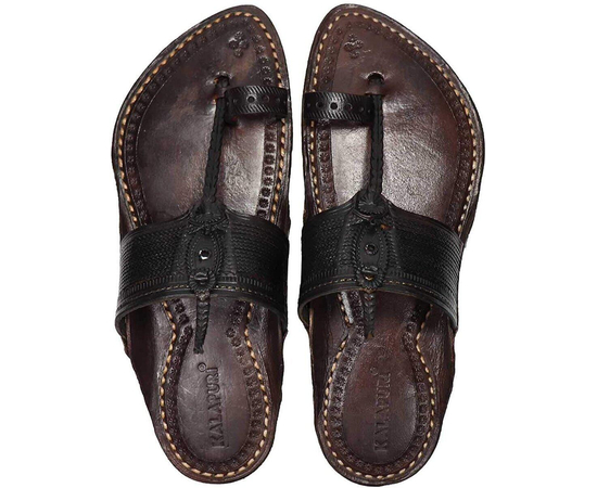 Mens Comfortable Kolhapuri Chappal in Export Quality Genuine Leather with Coffee Kapashi Shape Base and Traditional Veni Upper Black Colour. Handmade