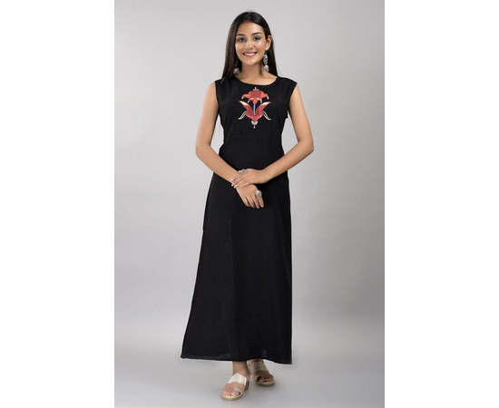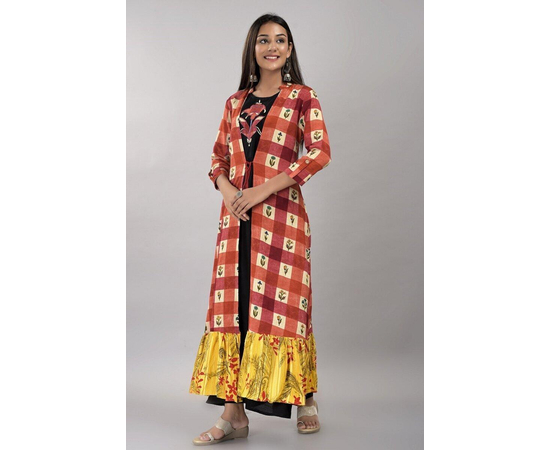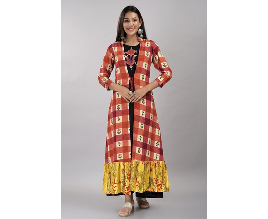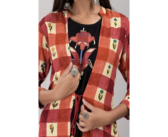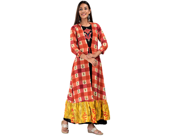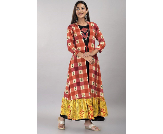 Black Embroidered full length Sleeveless gown with Printed Multicolor Jacket Shrug, rayon fabric designer Maxi dress for women