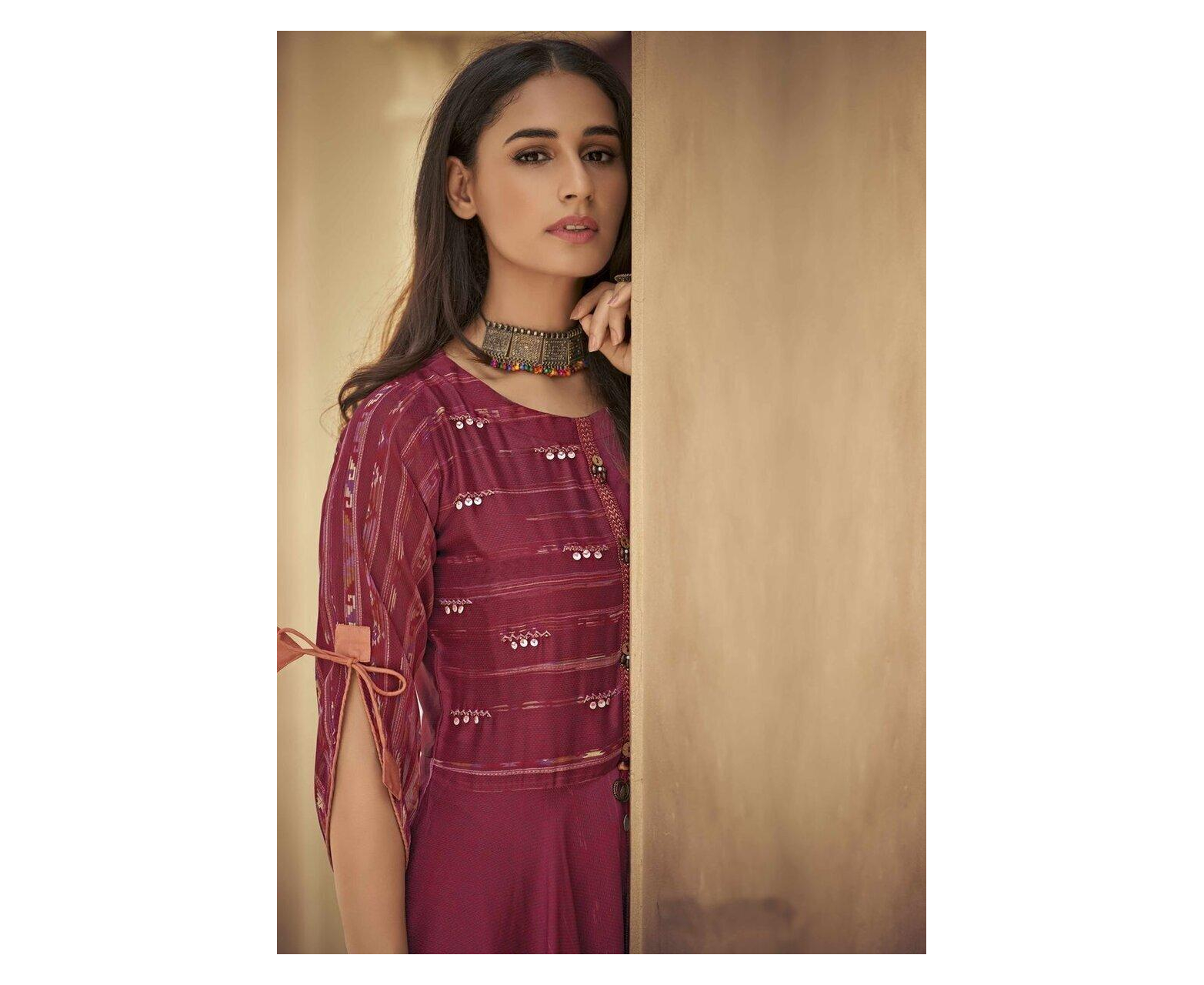 This Maroon Silk-blend Gown is the perfect choice for a weekend outing. It is designed in an A-line dress style, with a mock Angrakha bodice. The Kurti is printed all over with floral and abstract patterns. The flower print on the bodice is highlighted with sequins and thread embroidery.