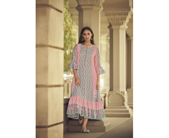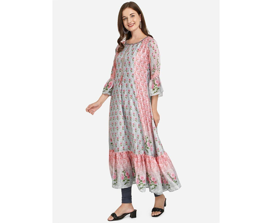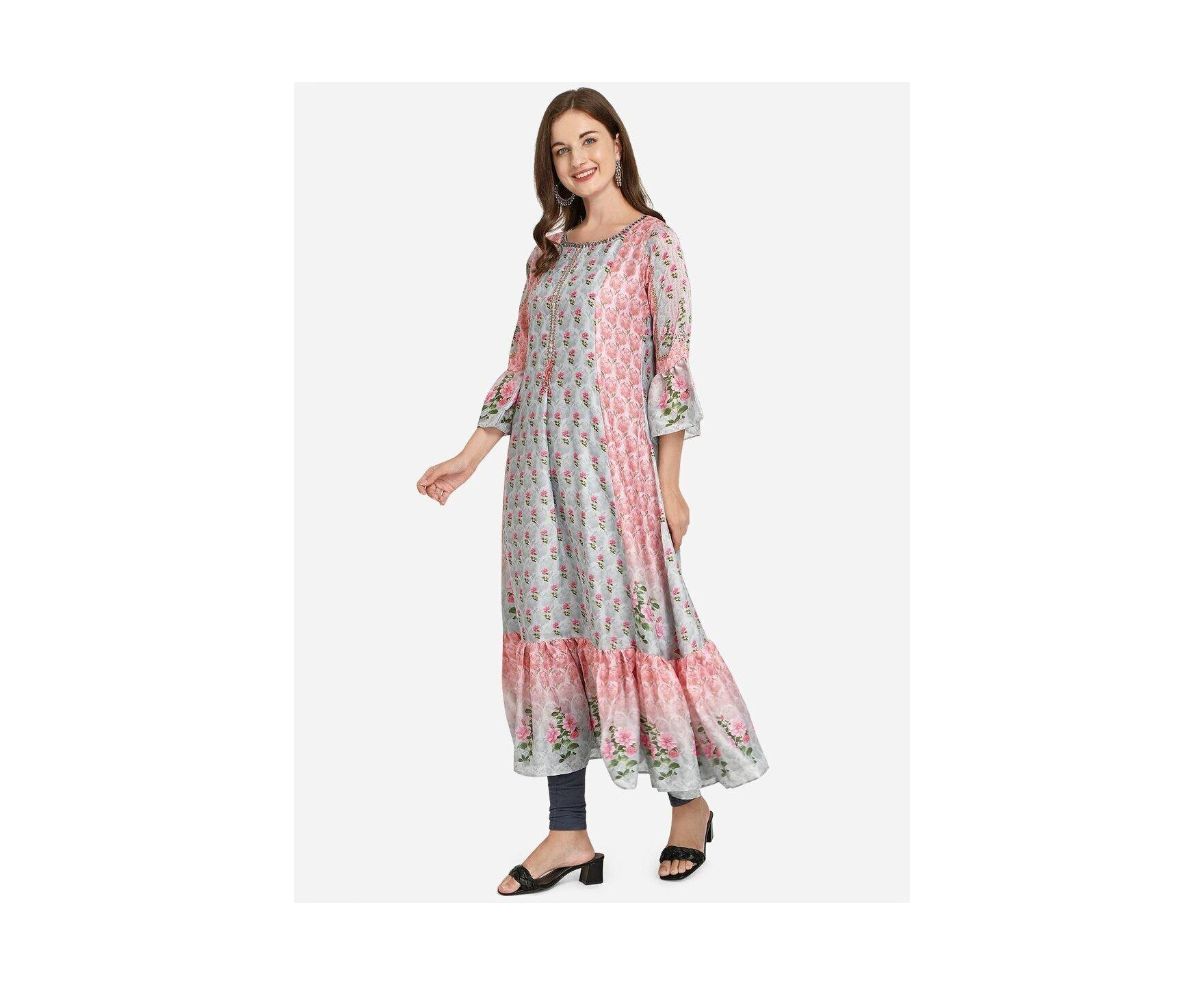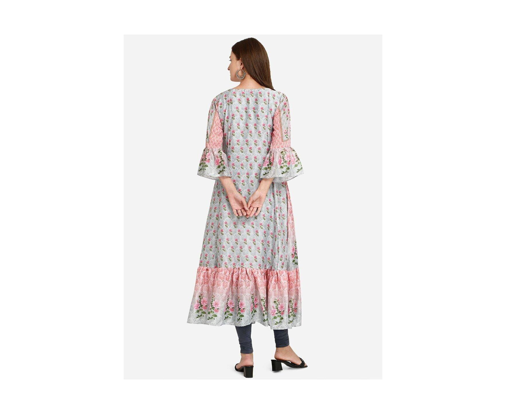 This Multicolor Silk-blend Gown is the perfect choice for a weekend outing. It is designed in an A-line dress style, with a mock Angrakha bodice. The Kurti is printed all over with floral and abstract patterns. The flower print on the bodice is highlighted with sequins and thread embroidery.