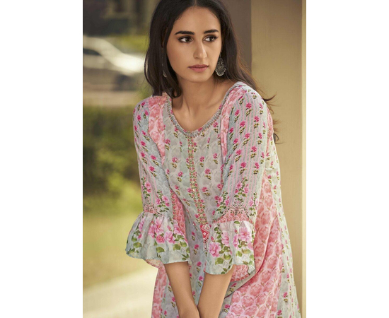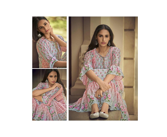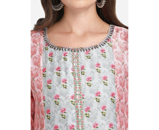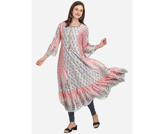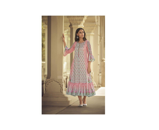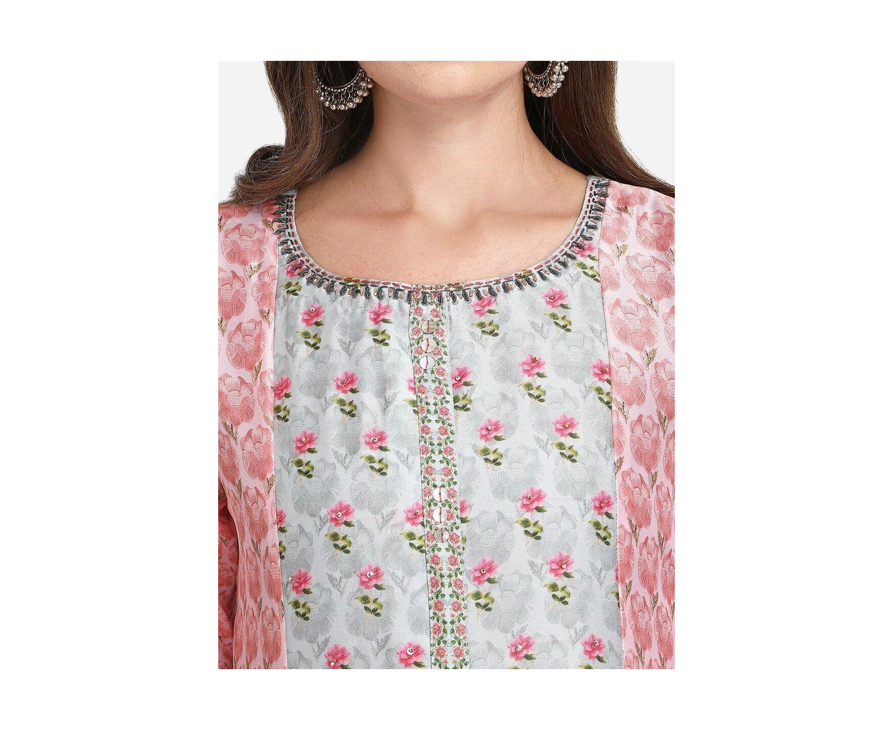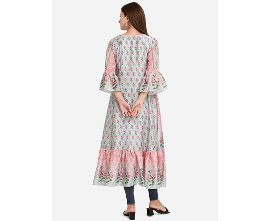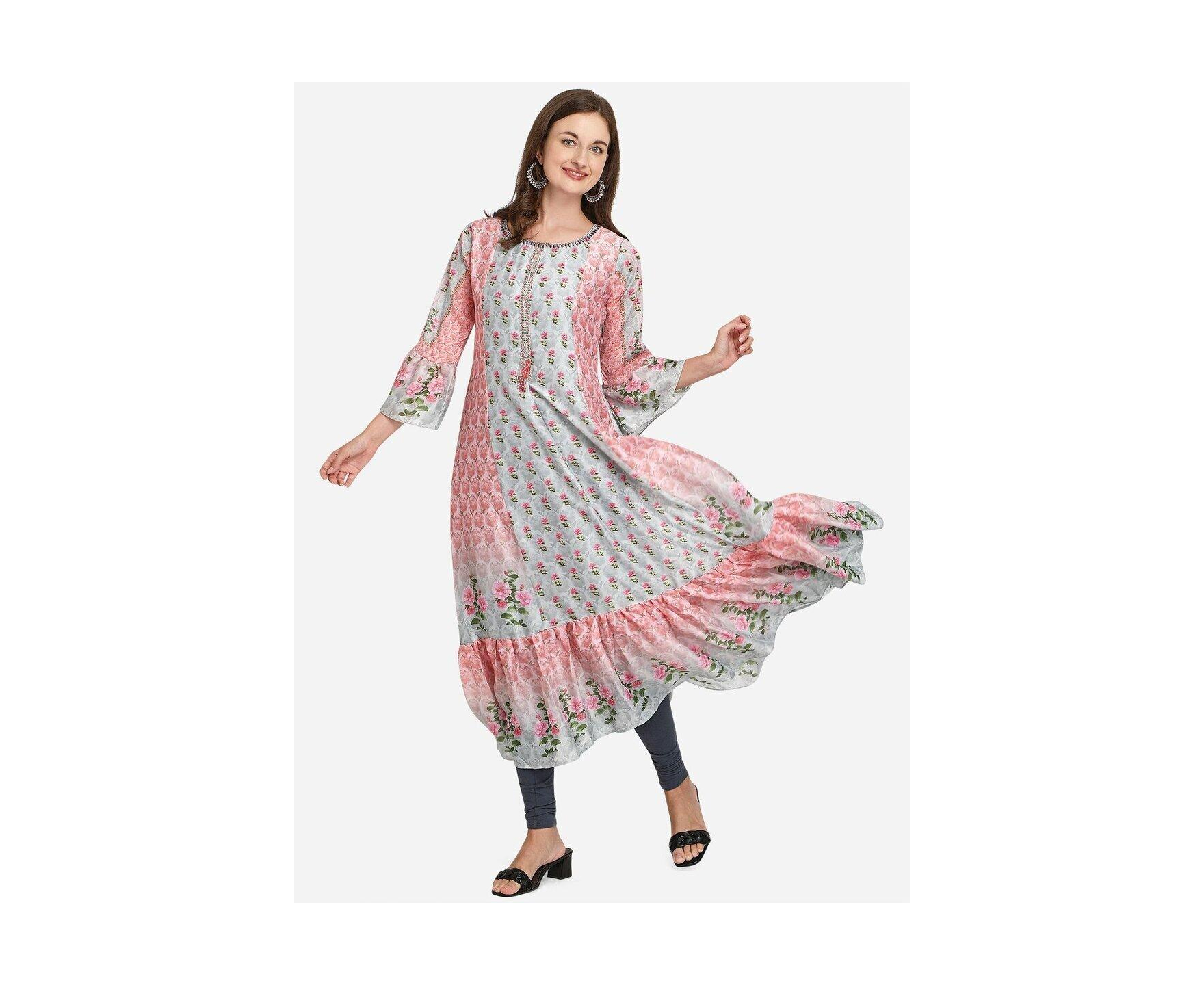 This Multicolor Silk-blend Gown is the perfect choice for a weekend outing. It is designed in an A-line dress style, with a mock Angrakha bodice. The Kurti is printed all over with floral and abstract patterns. The flower print on the bodice is highlighted with sequins and thread embroidery.