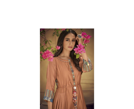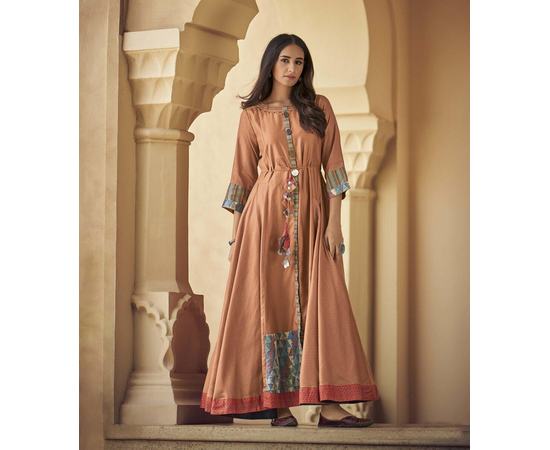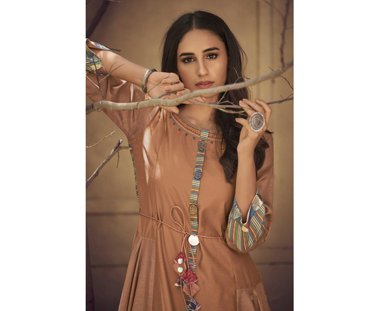 This Brown Silk-blend Gown is the perfect choice for a weekend outing. It is designed in an A-line dress style, with a mock Angrakha bodice. The Kurti is printed all over with floral and abstract patterns. The flower print on the bodice is highlighted with sequins and thread embroidery.