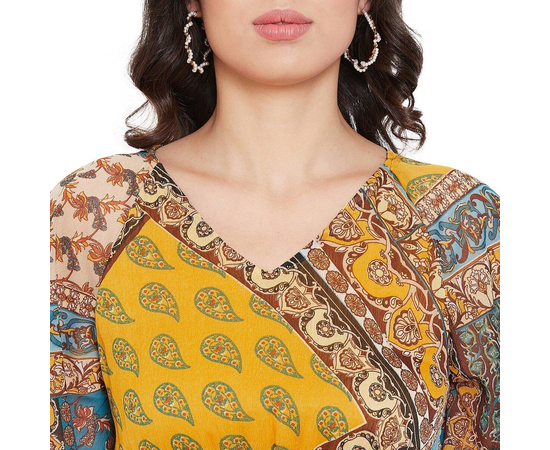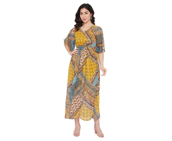 Women's Georgette Printed With Cotton Lining Yellow Blue Printed Dress.