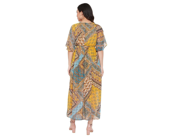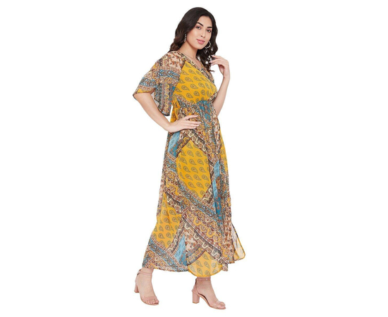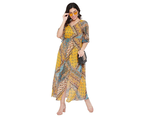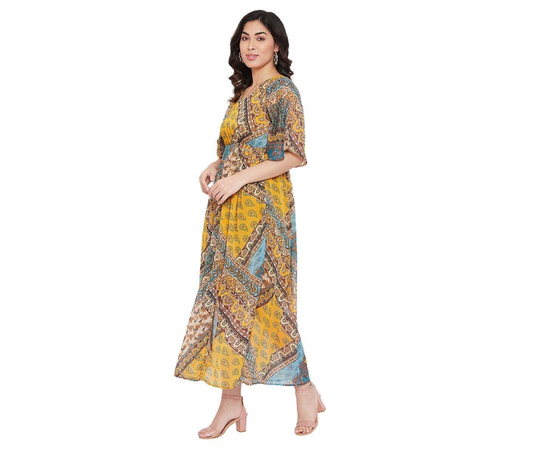 Women's Georgette Printed With Cotton Lining Yellow Blue Printed Dress | Slit Maxi Party Dress | Vintage Print Long Dress