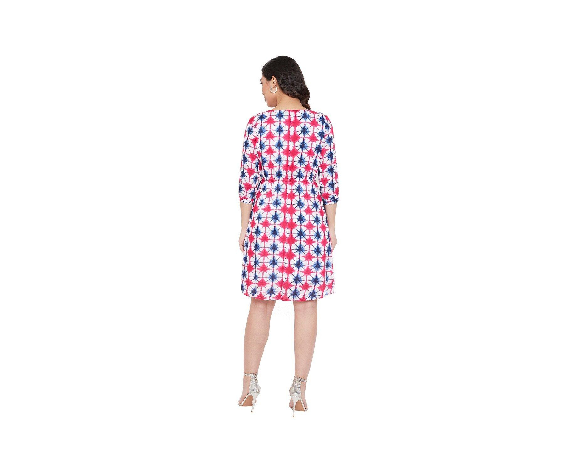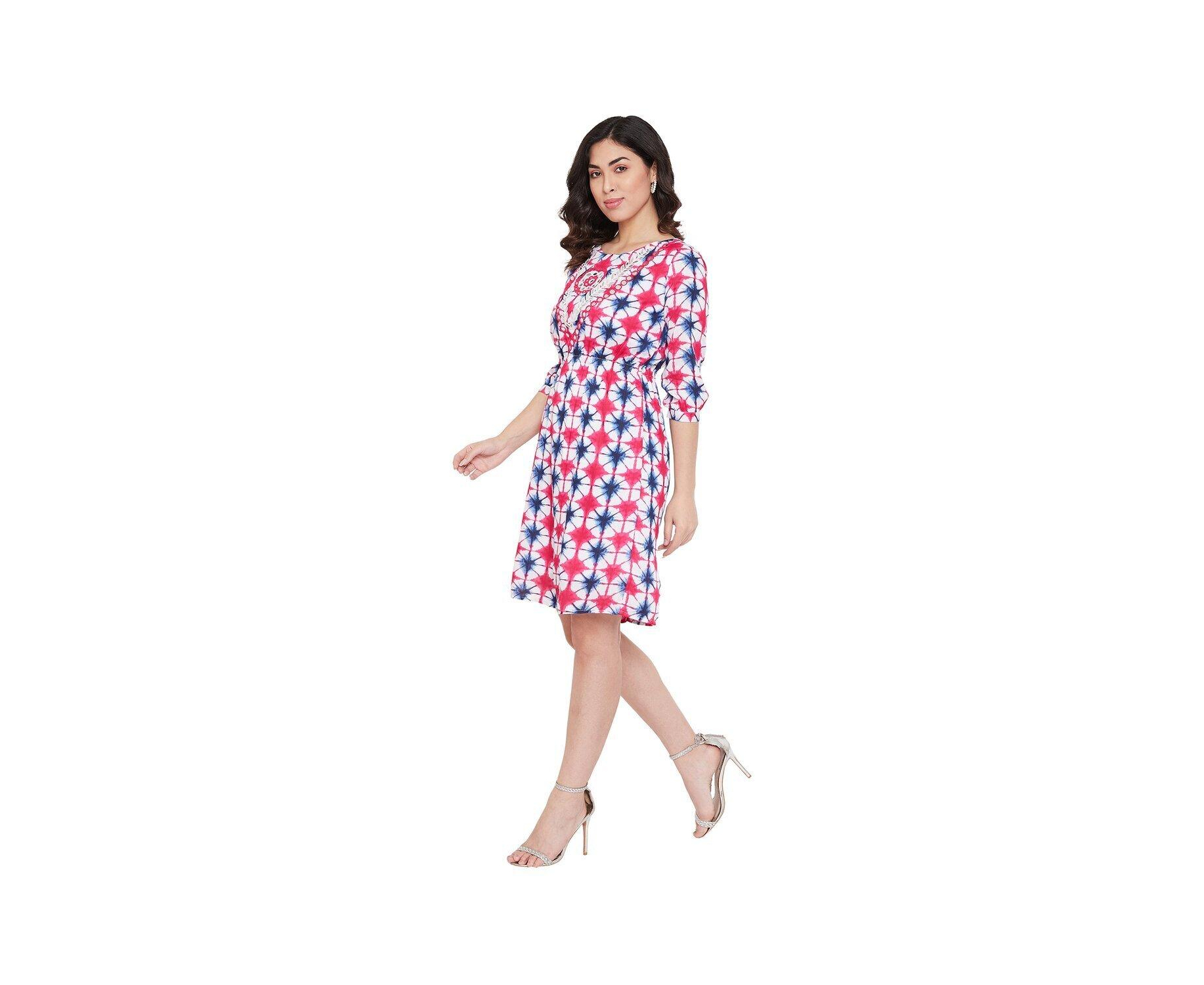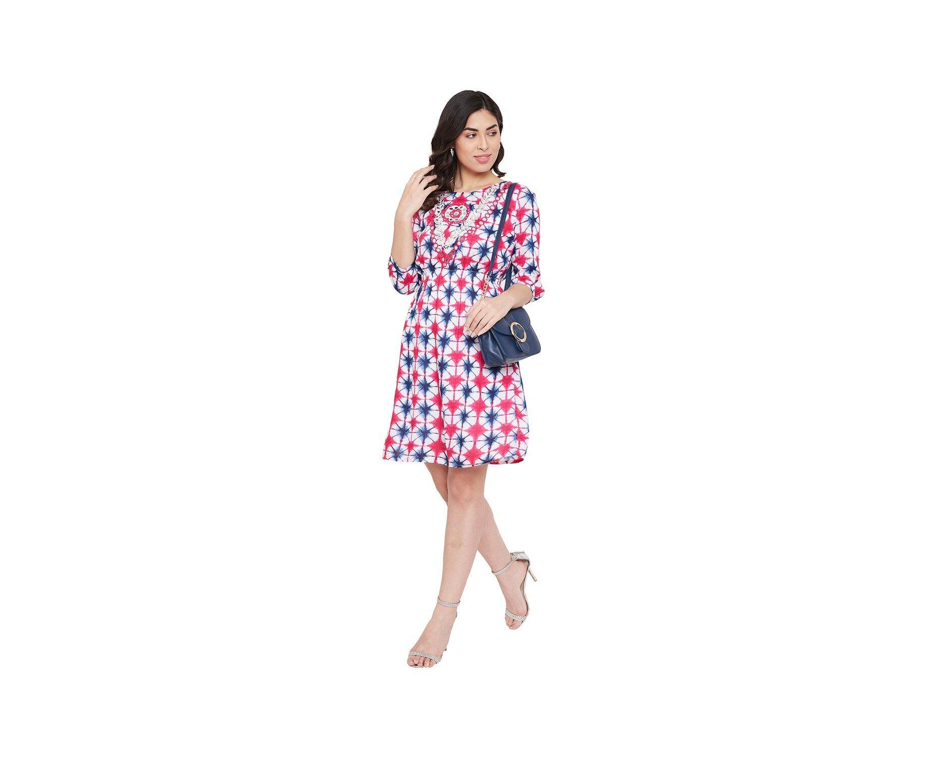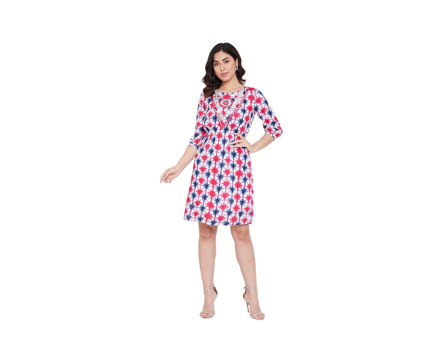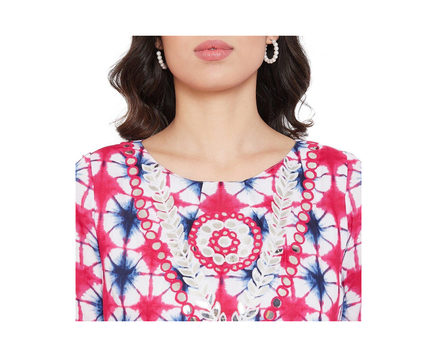 Women's Rayon Mirror Work Embroidered Pink and Blue Dress - Bohemian Style Dress - Indian Ethnic Printed Tunic Top Flared Kurti