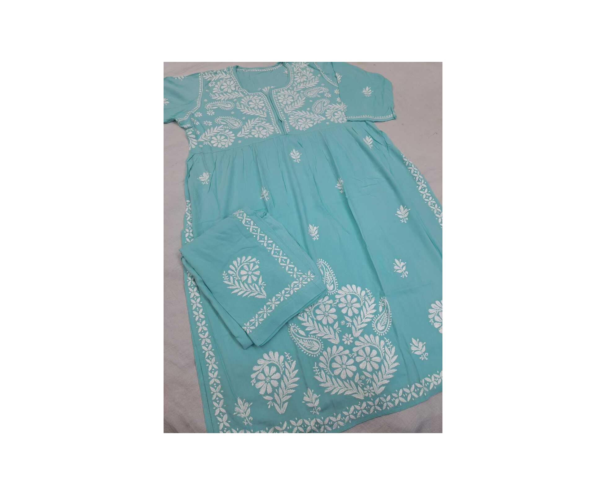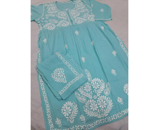 The Naira-cut silhouette adds a graceful flair that flatters all body types, while the intricate Chikankari embroidery, done by skilled artisans, adorns the kurti with delicate floral patterns, enhancing its ethnic charm. Paired with a matching rayon pant that ensures ease of movement and a breezy feel, this outfit is perfect for festive gatherings, casual get-togethers, or elegant daywear.